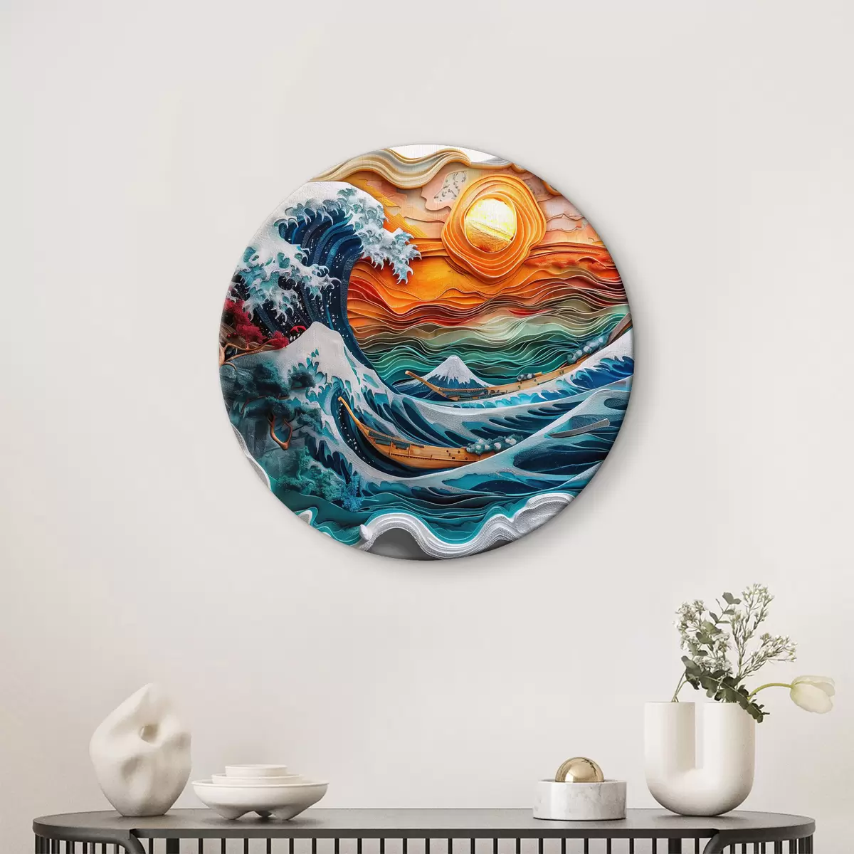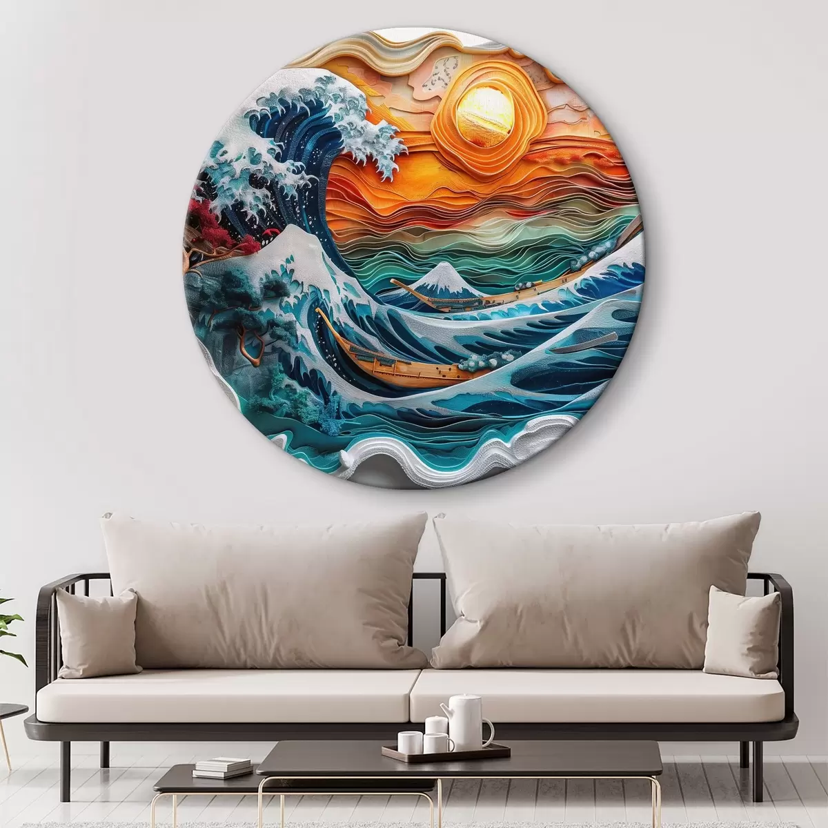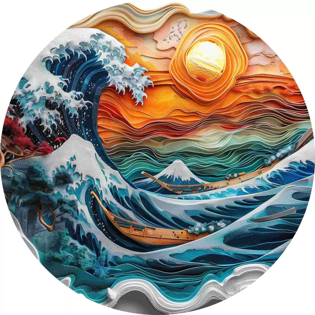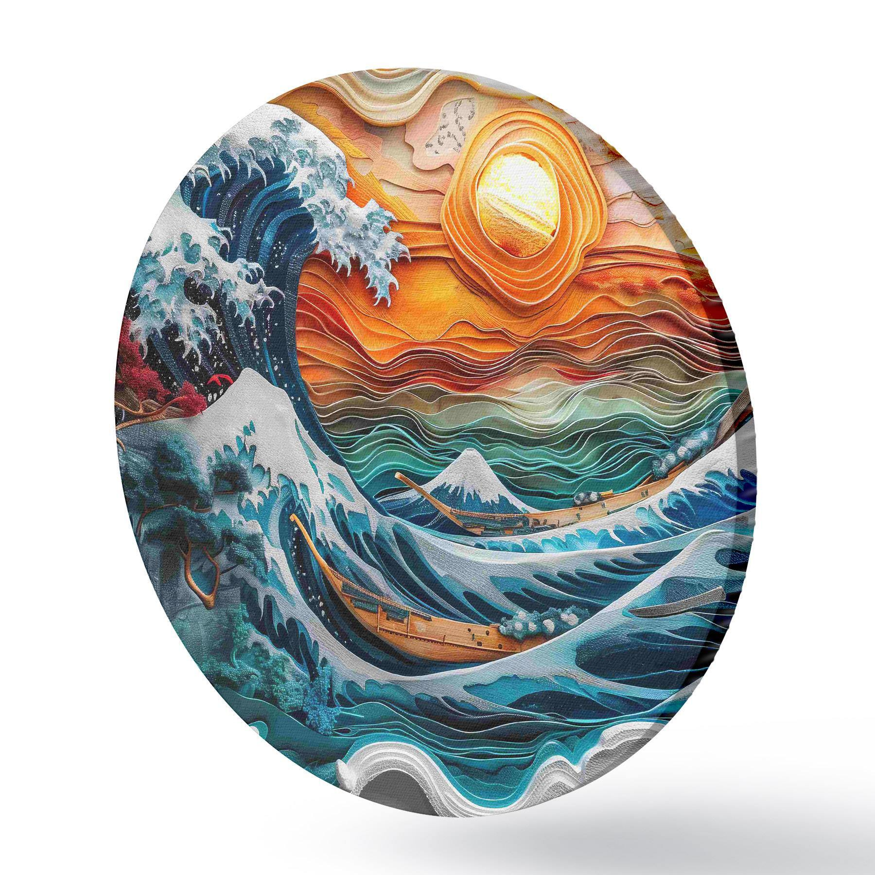 Quadri rotondi Imitazione di un bassorilievo: un oceano impetuoso con barche e sole r40976