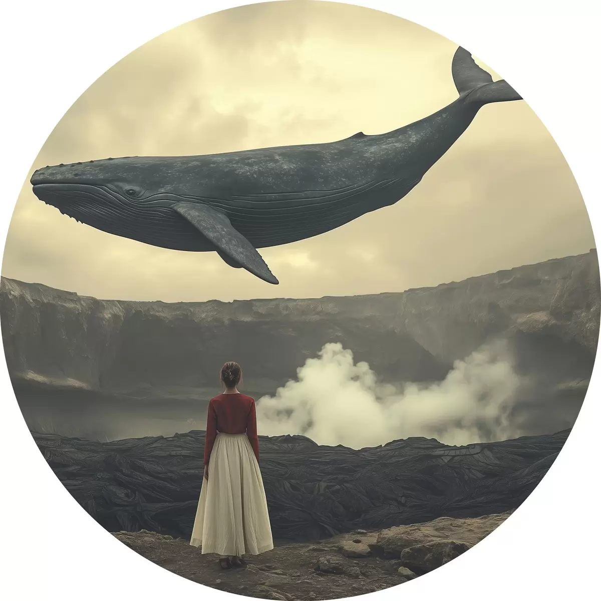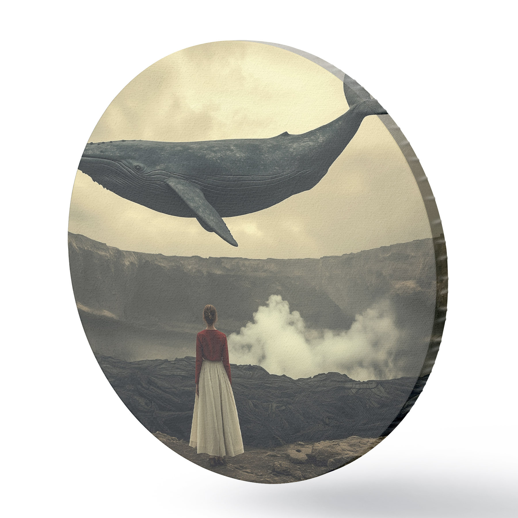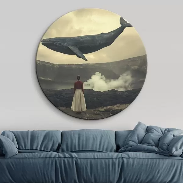 Quadri rotondi Ragazza sulla lava con una grande balena volante nel cielo r40986