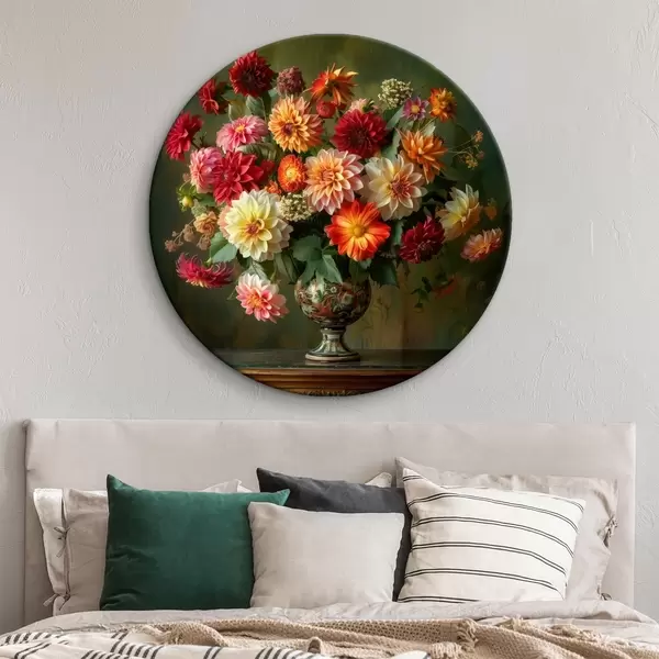 Quadri rotondi Un lussureggiante bouquet di crisantemi in vaso su uno sfondo di verde intenso r41001