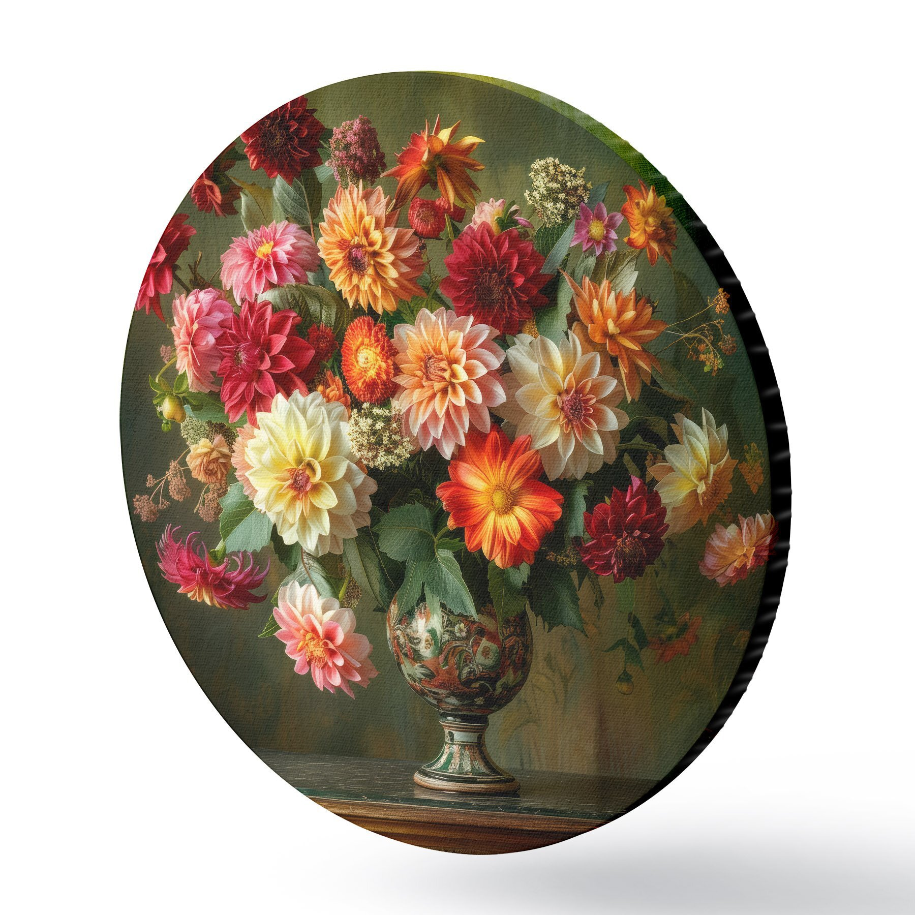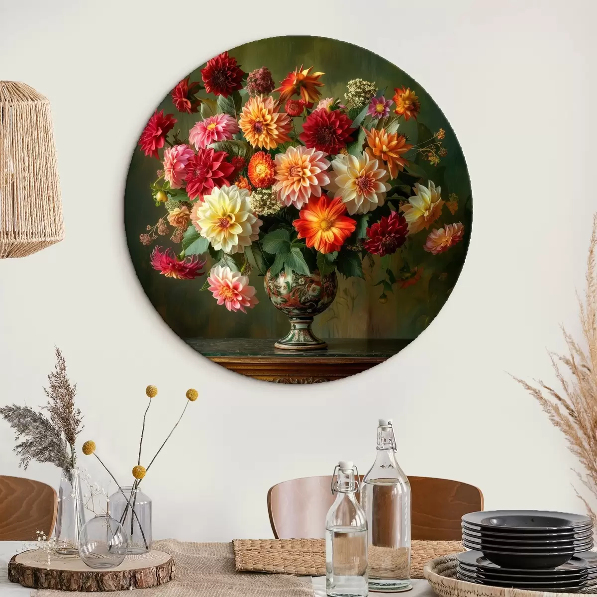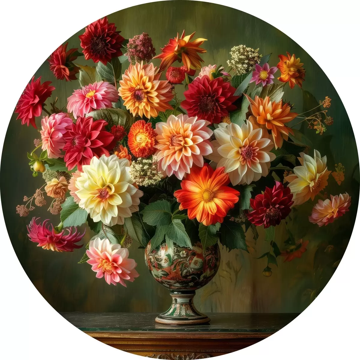 Quadri rotondi Un lussureggiante bouquet di crisantemi in vaso su uno sfondo di verde intenso r41001