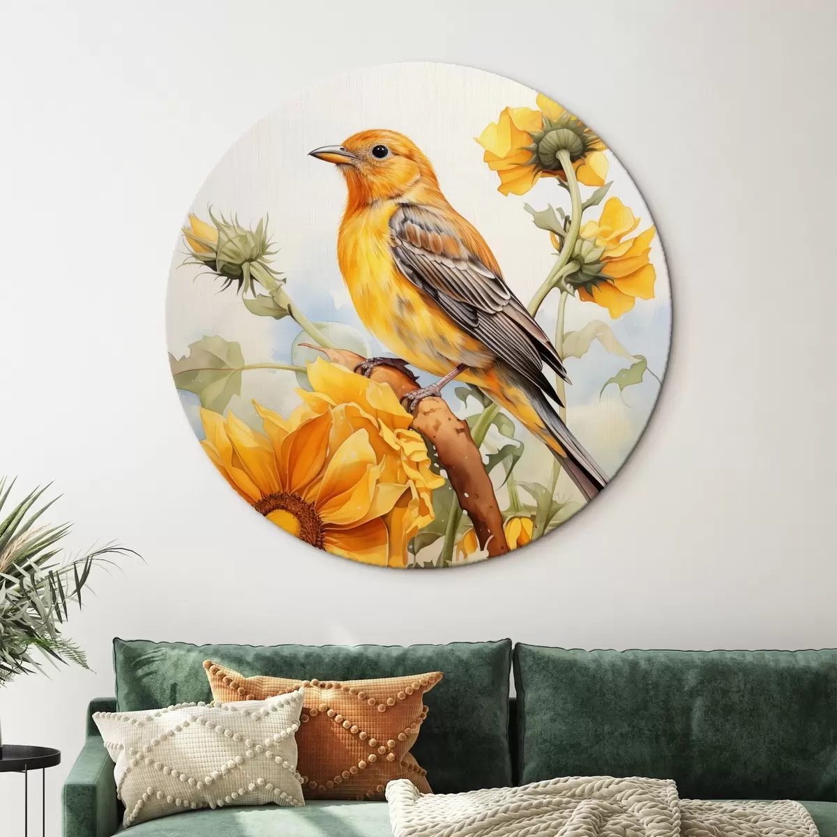 Quadri rotondi Uccello giallo seduto su un girasole acquerello r41015