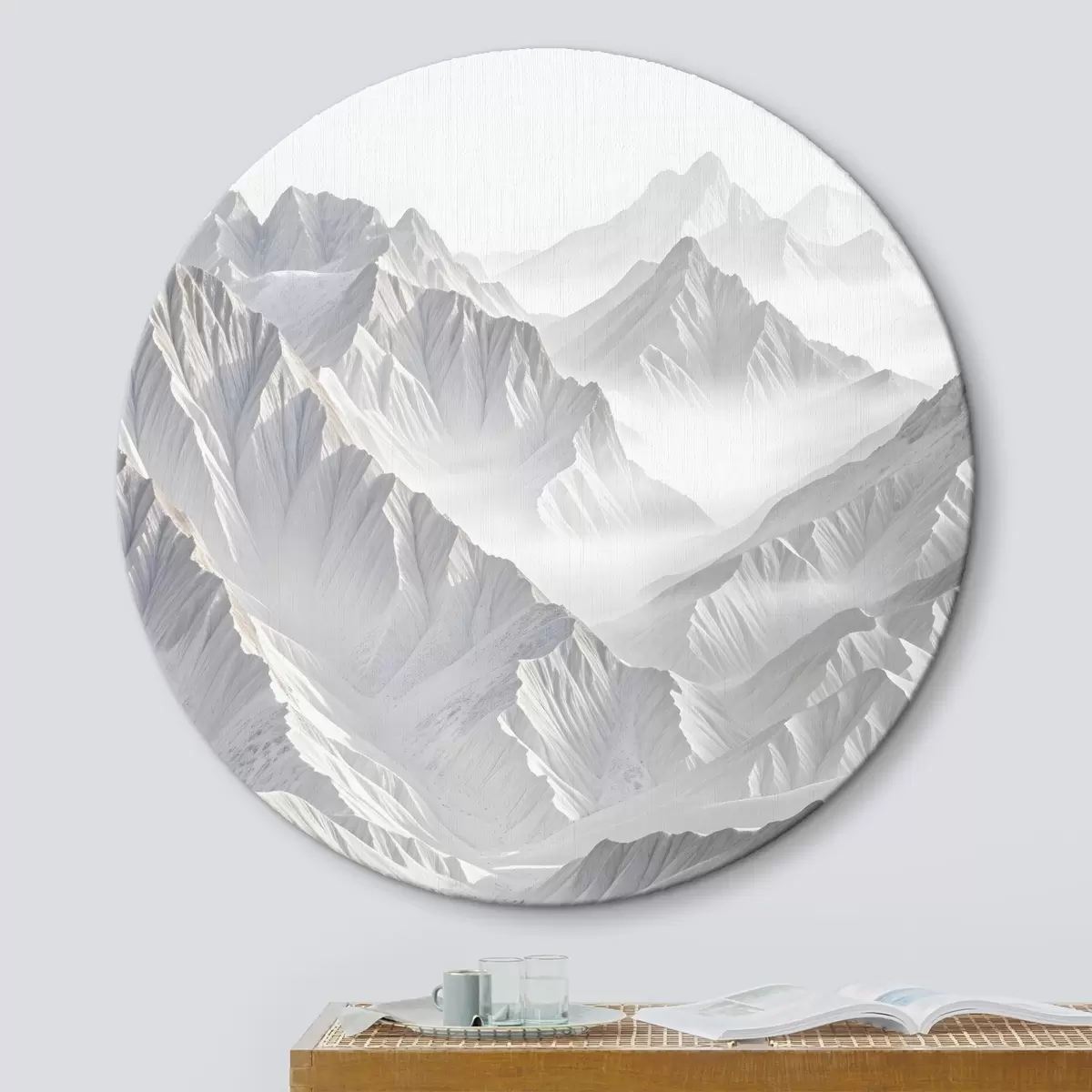 Quadri rotondi Cime di montagna minimaliste innevate in un paesaggio nebbioso e nebbioso r41083