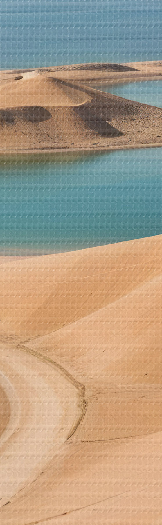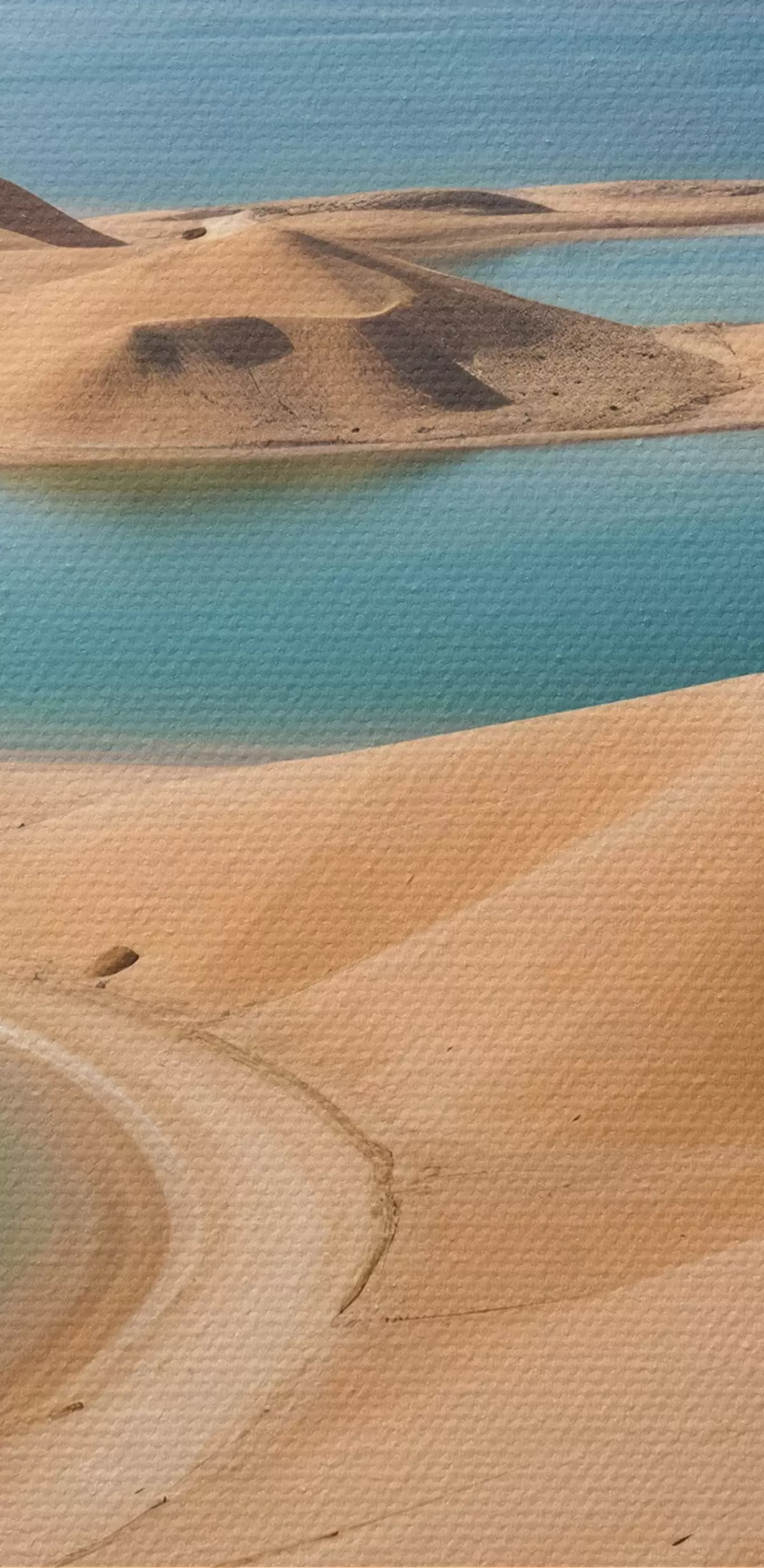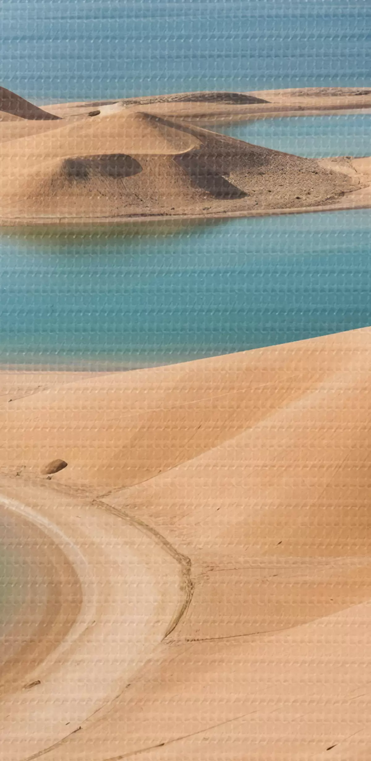 Immagine Un vasto paesaggio desertico con dune ondulate e laghi turchesi, circondato da aspre montagne Nr r41087