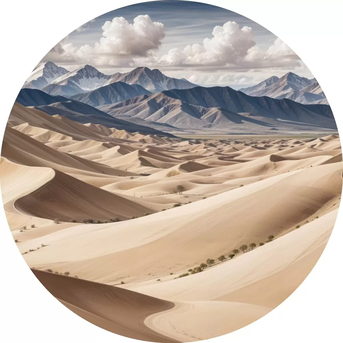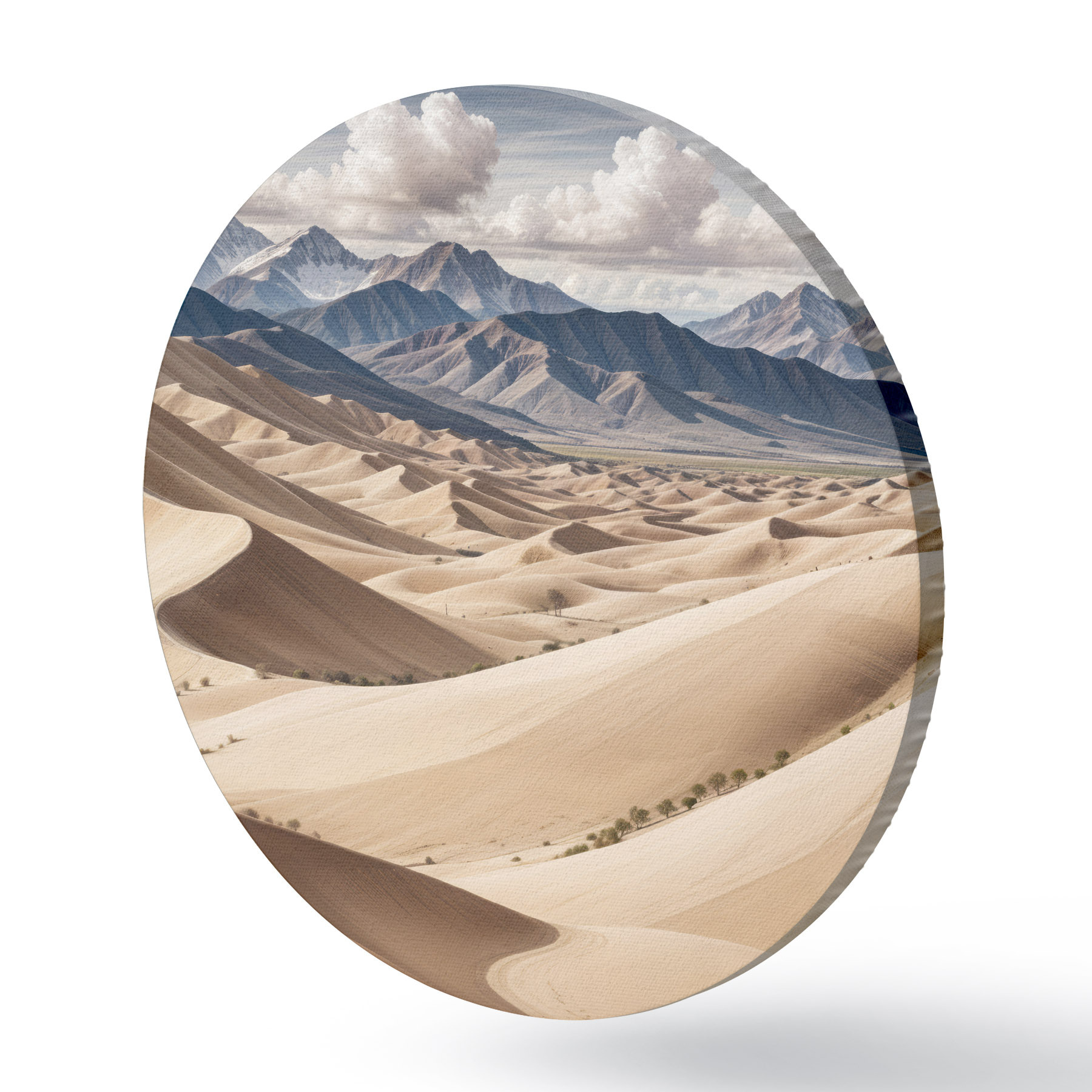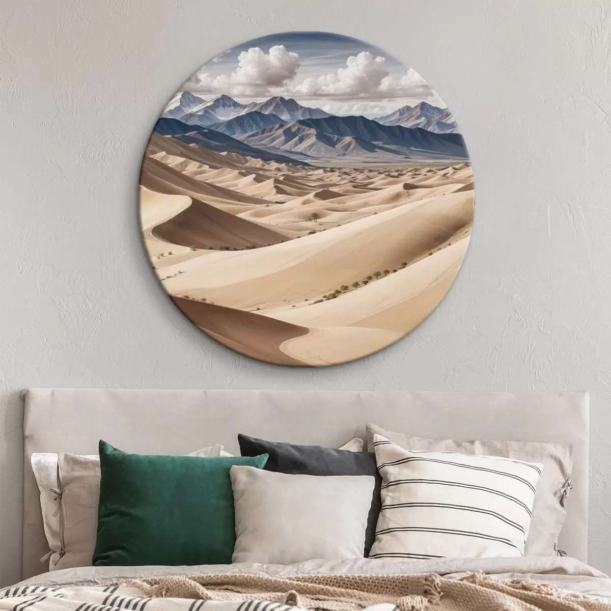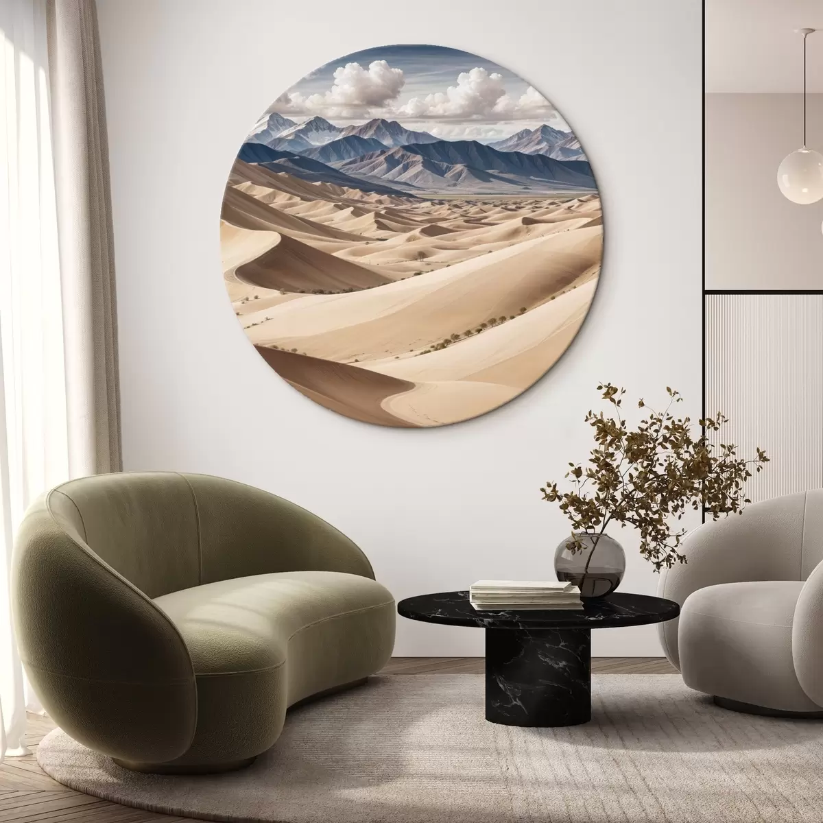 Quadri rotondi Un vasto paesaggio desertico con dune ondulate, aspre montagne in lontananza e un drammatico cielo nuvoloso r41089