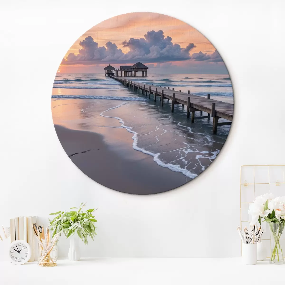 Quadri rotondi Molo di legno che si affaccia sull'oceano calmo al tramonto con nuvole colorate r41091