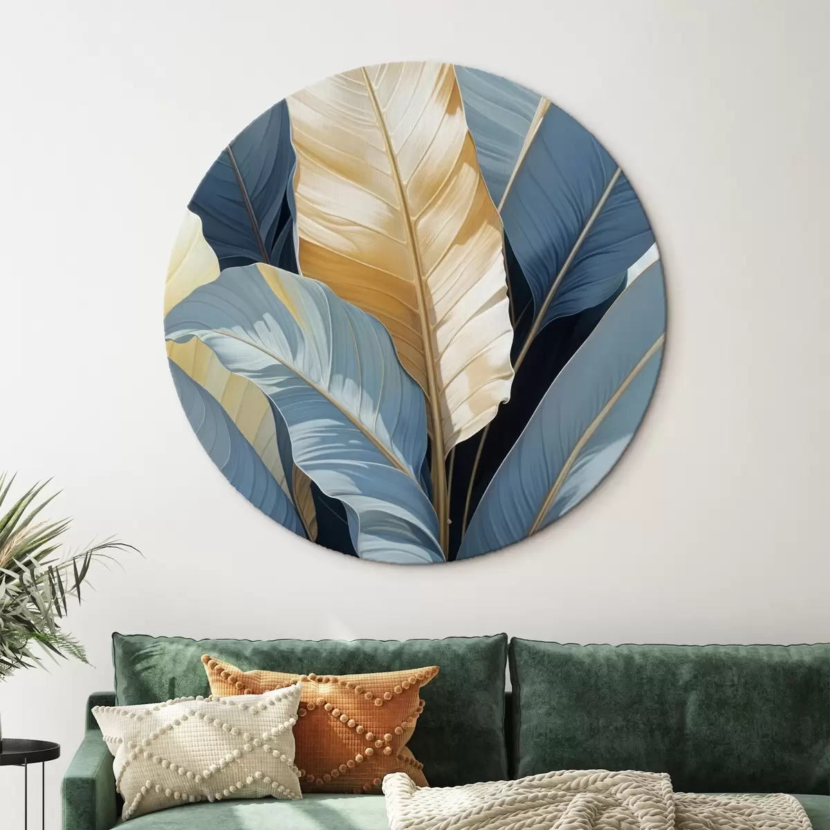 Quadri rotondi Foglie tropicali con sfumature blu e gialle, grandi foglie di palma o di banano con un lussureggiante sfondo naturale r41097