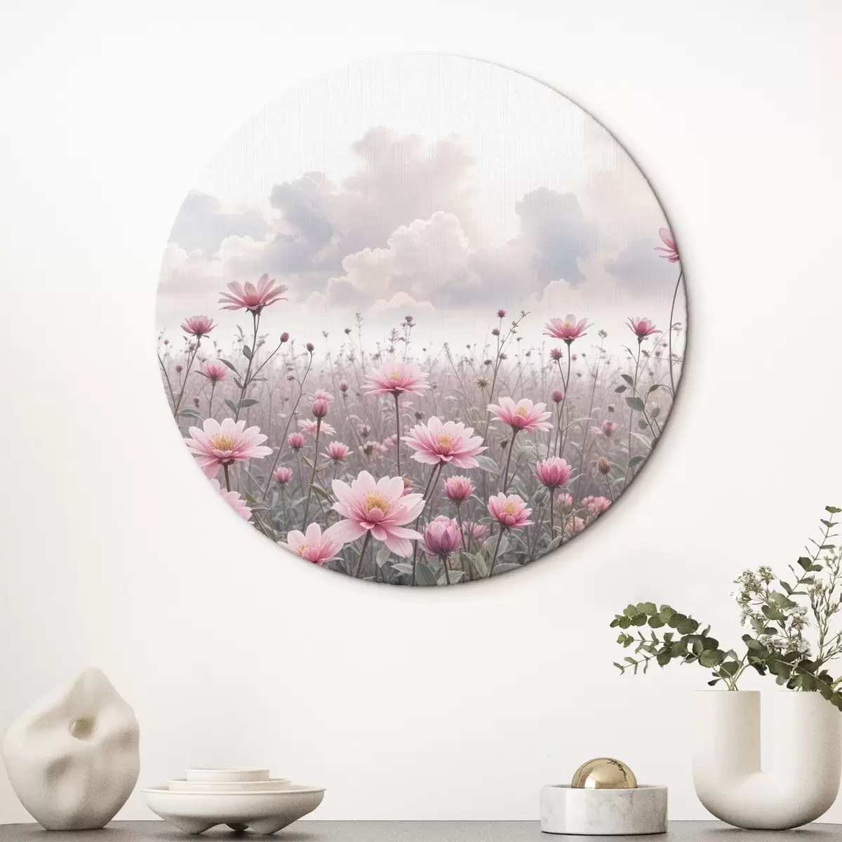 Quadri rotondi Un campo di fiori di margherite rosa contro un cielo nuvoloso r41102