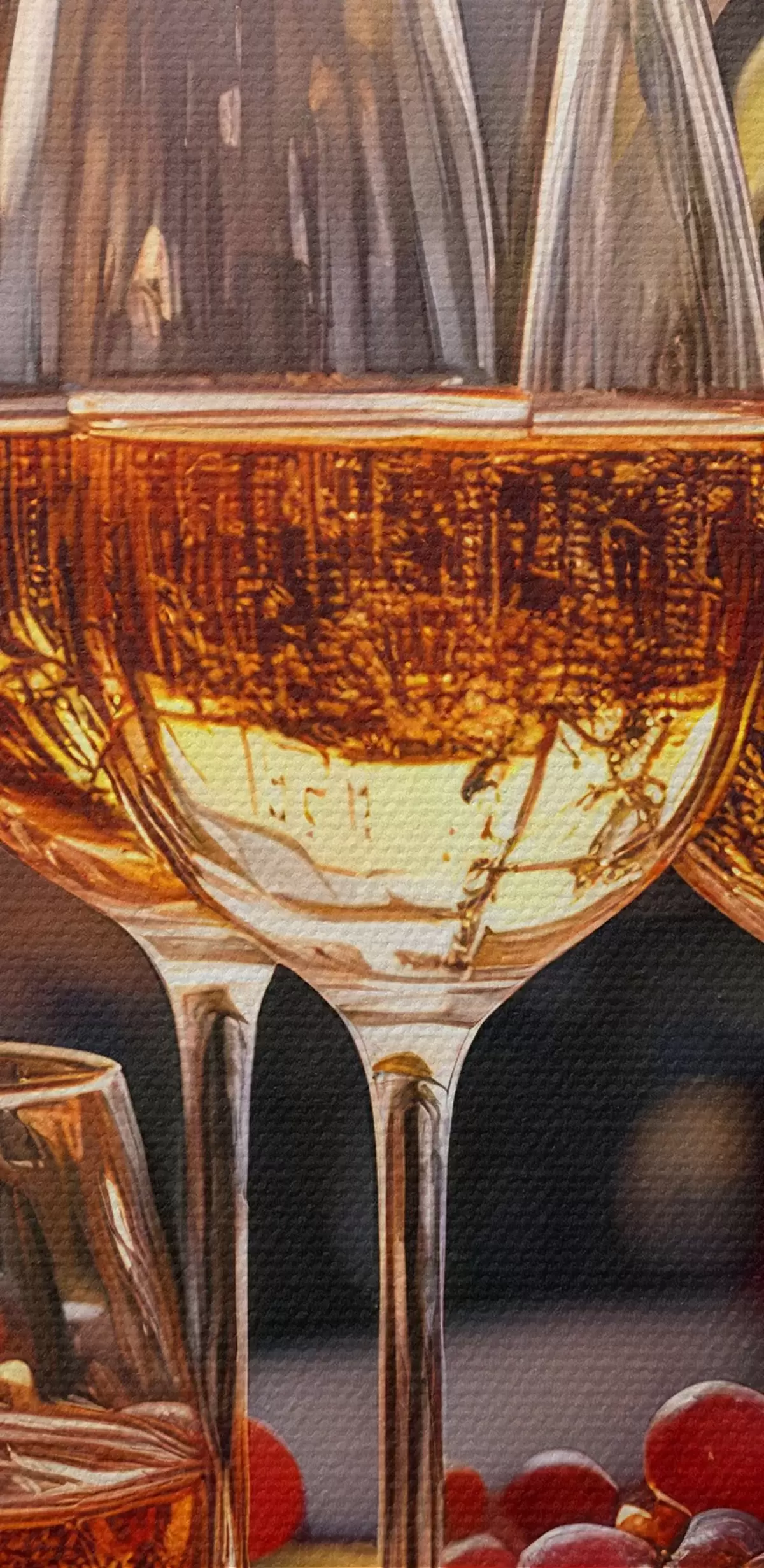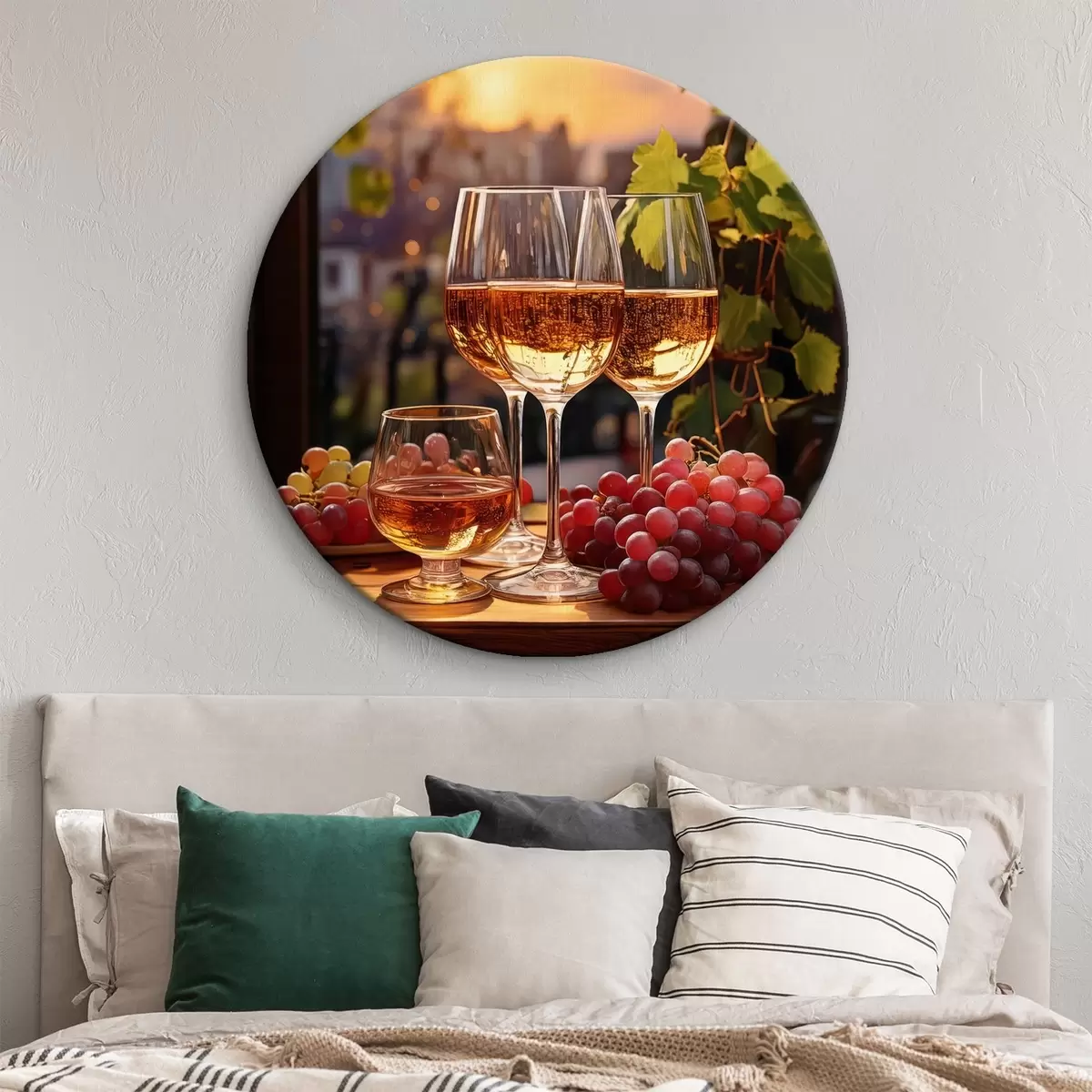 Quadri rotondi bicchieri con vino, uva sul tavolo, natura morta r41104