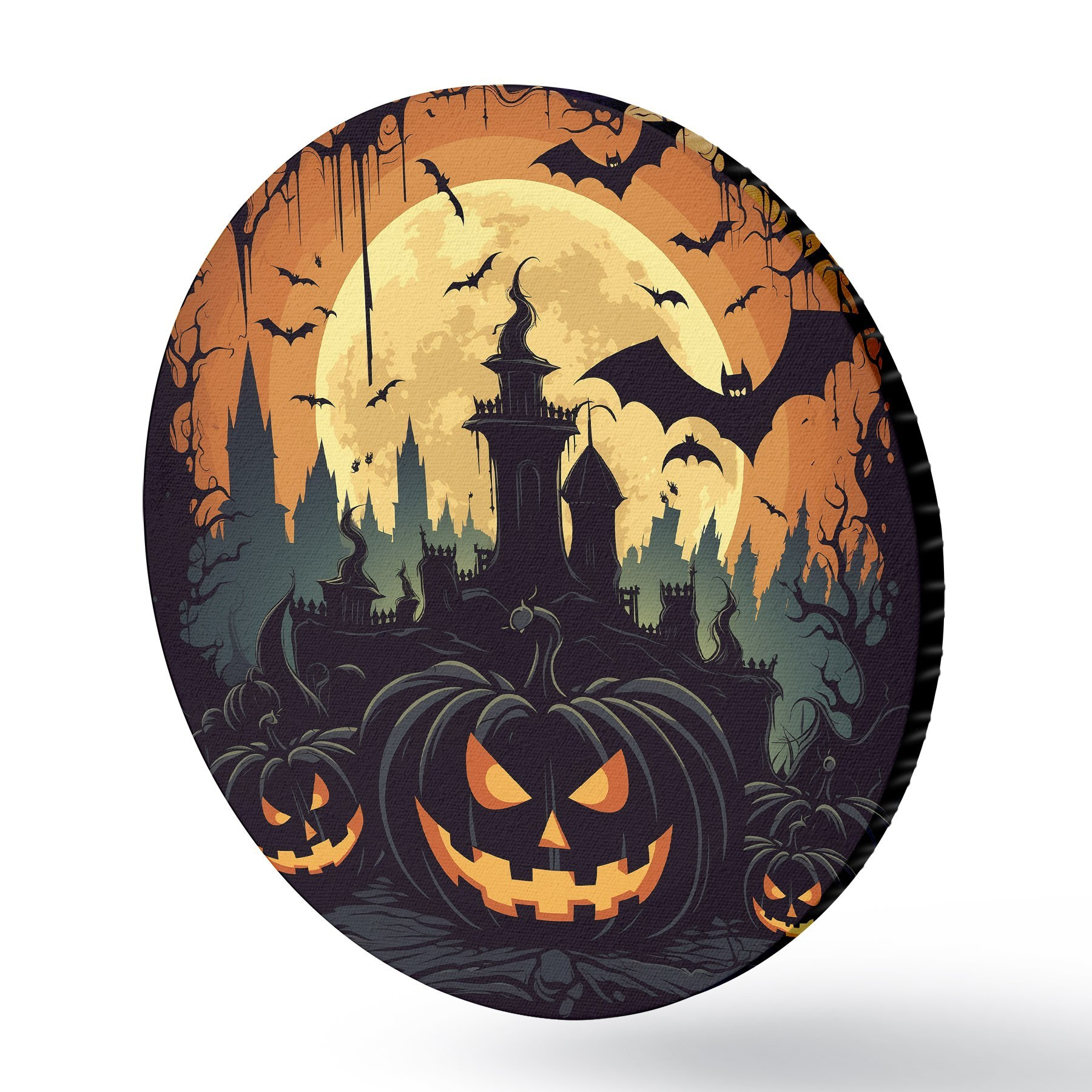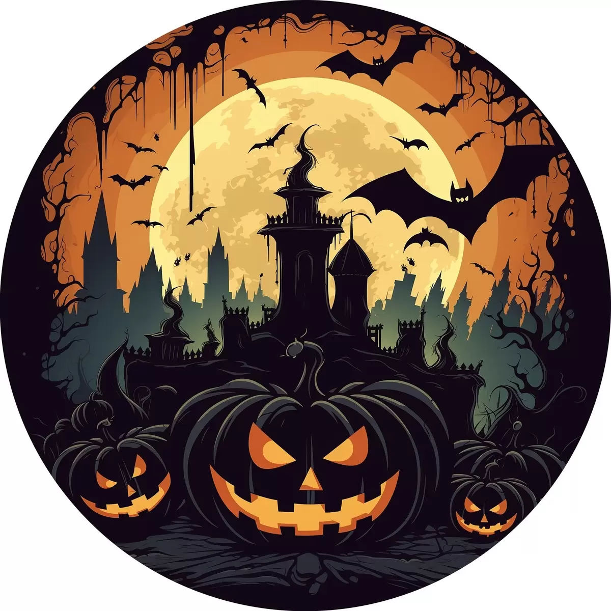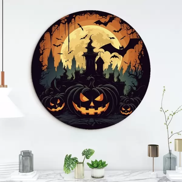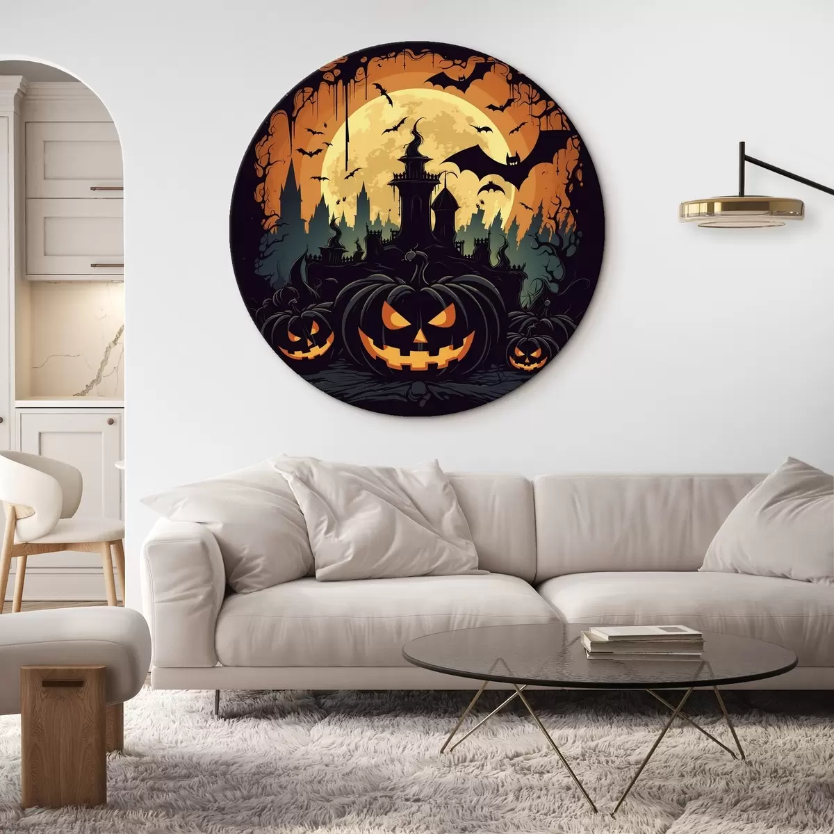 Quadri rotondi Halloween, castello sullo sfondo della luna piena, pipistrelli e zucche r41138