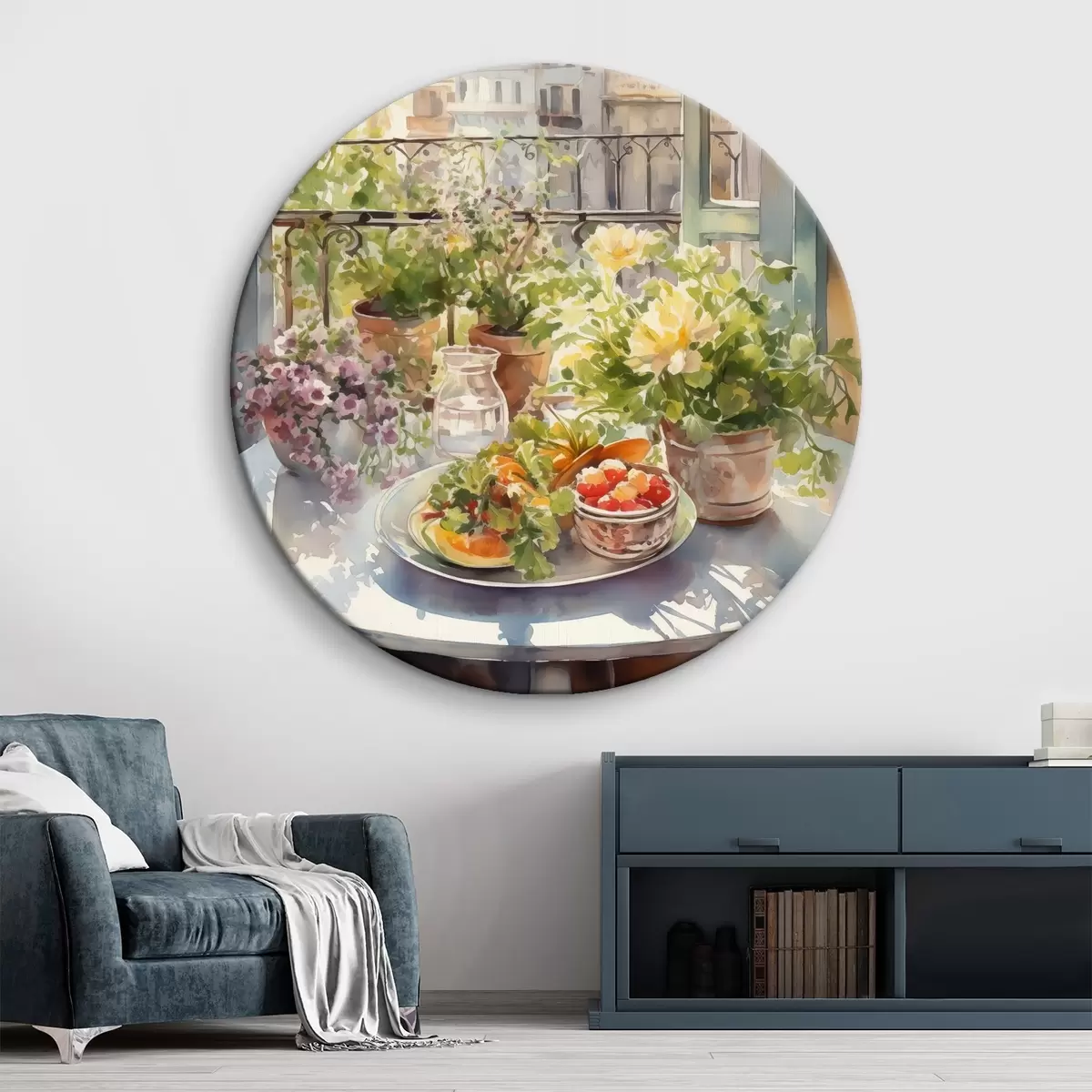 Quadri rotondi Cena romantica con vista sulla città, acquerello e fiori r41168