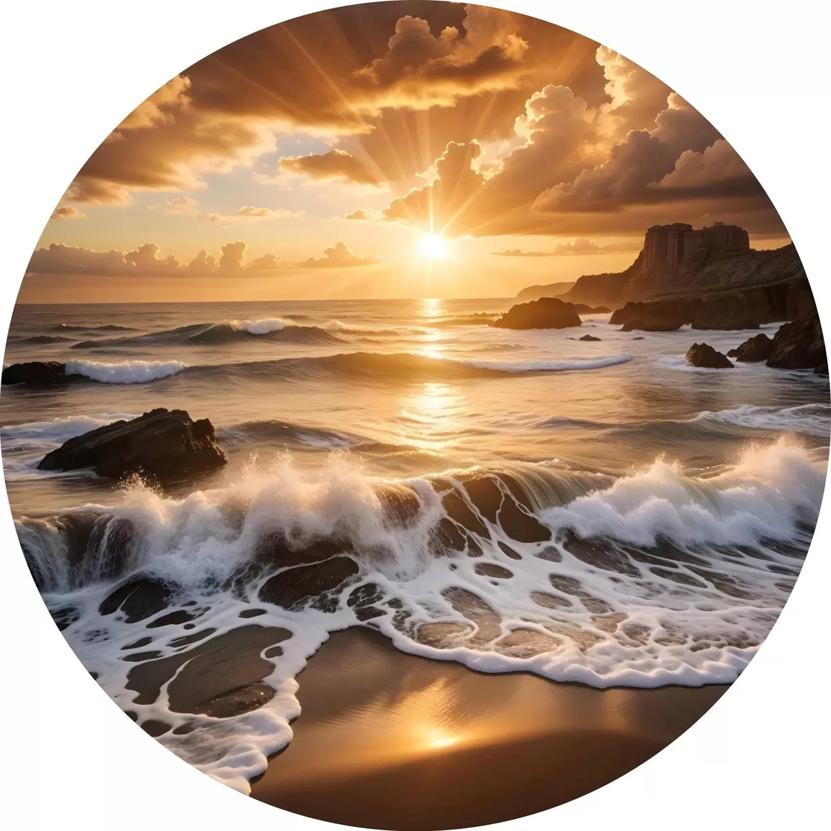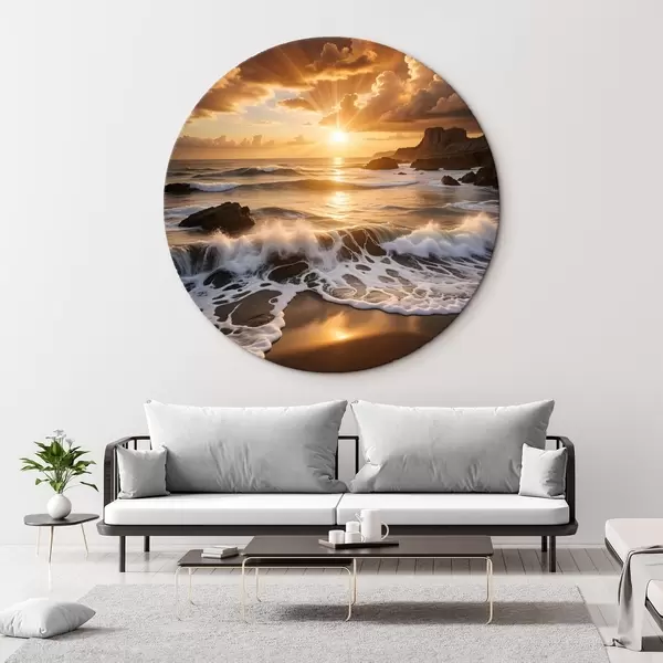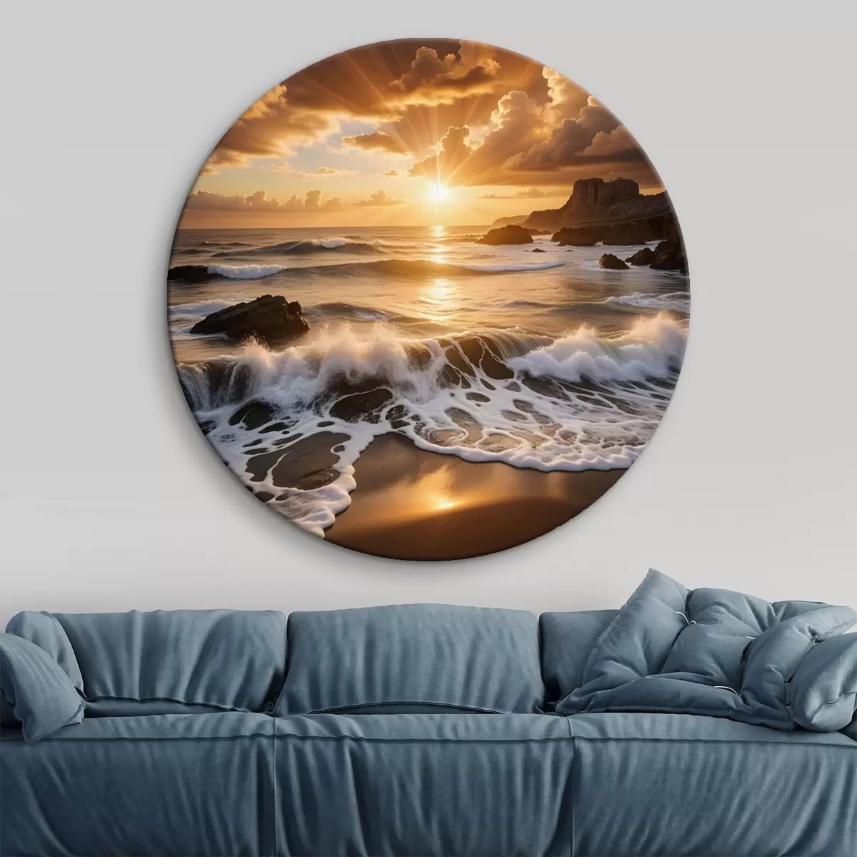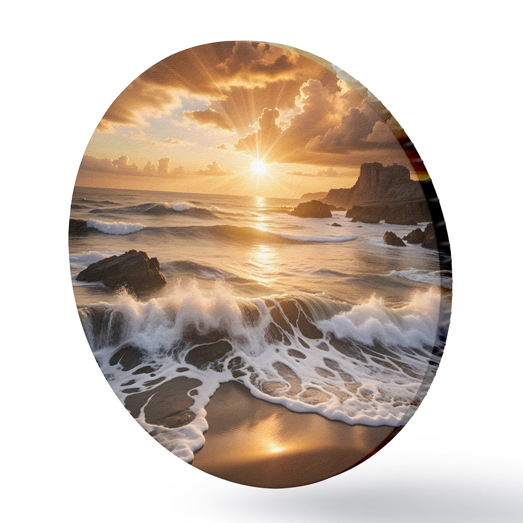 Quadri rotondi Drammatico tramonto sulla costa rocciosa, con onde che si infrangono e nuvole drammatiche nel cielo r41245