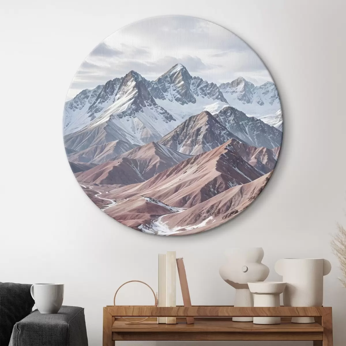 Quadri rotondi Montagne aspre e innevate con un fiume tortuoso che scorre in un paesaggio vasto e colorato r41262