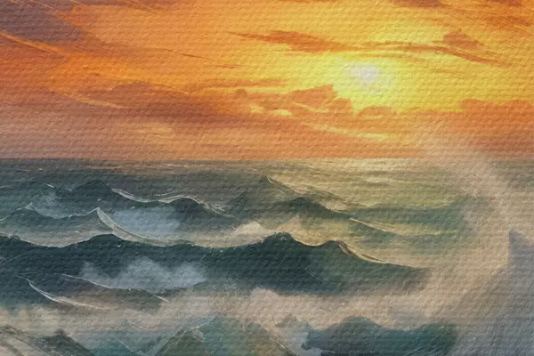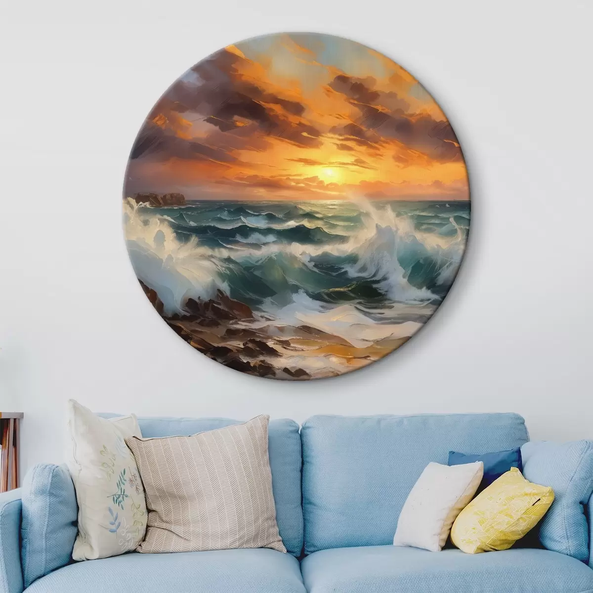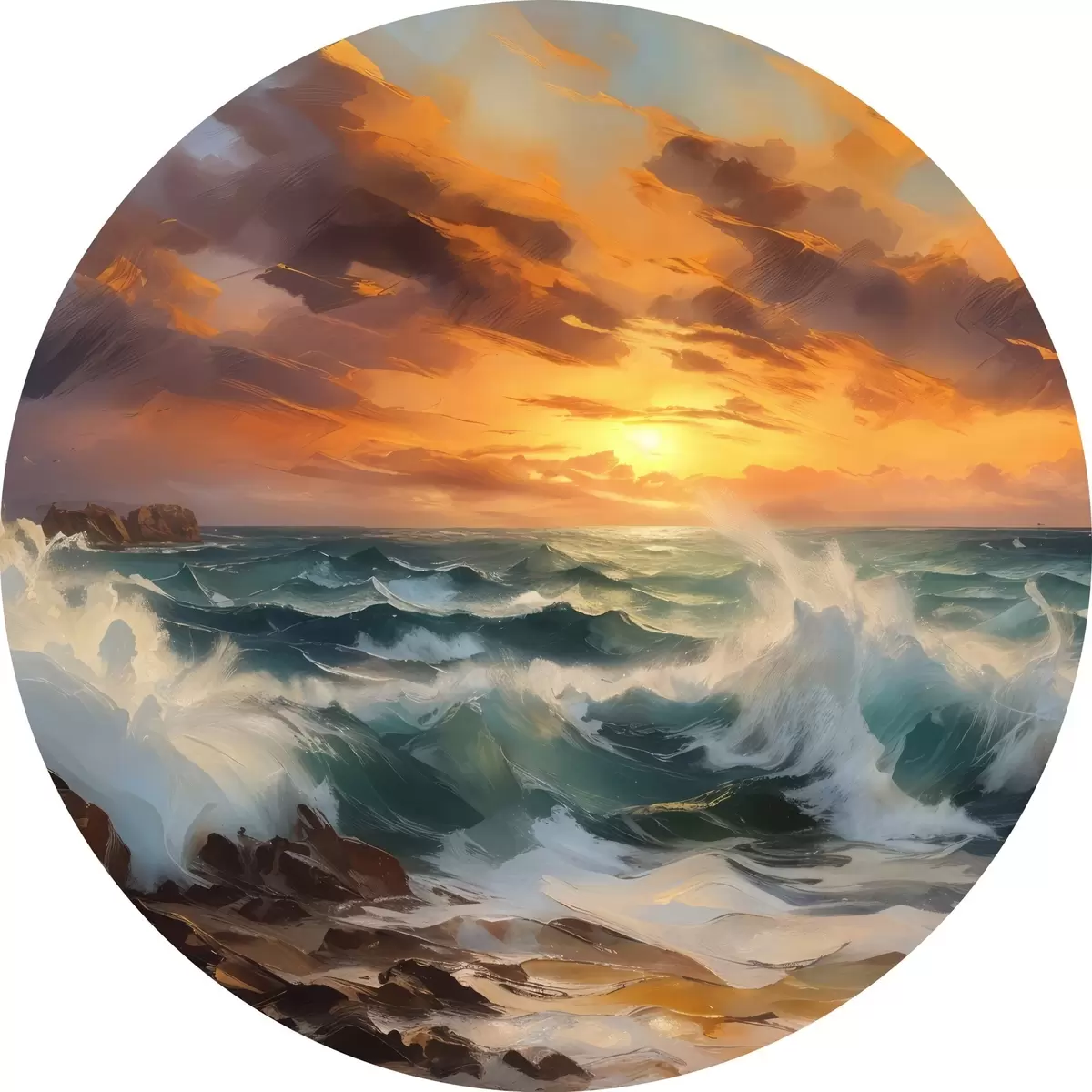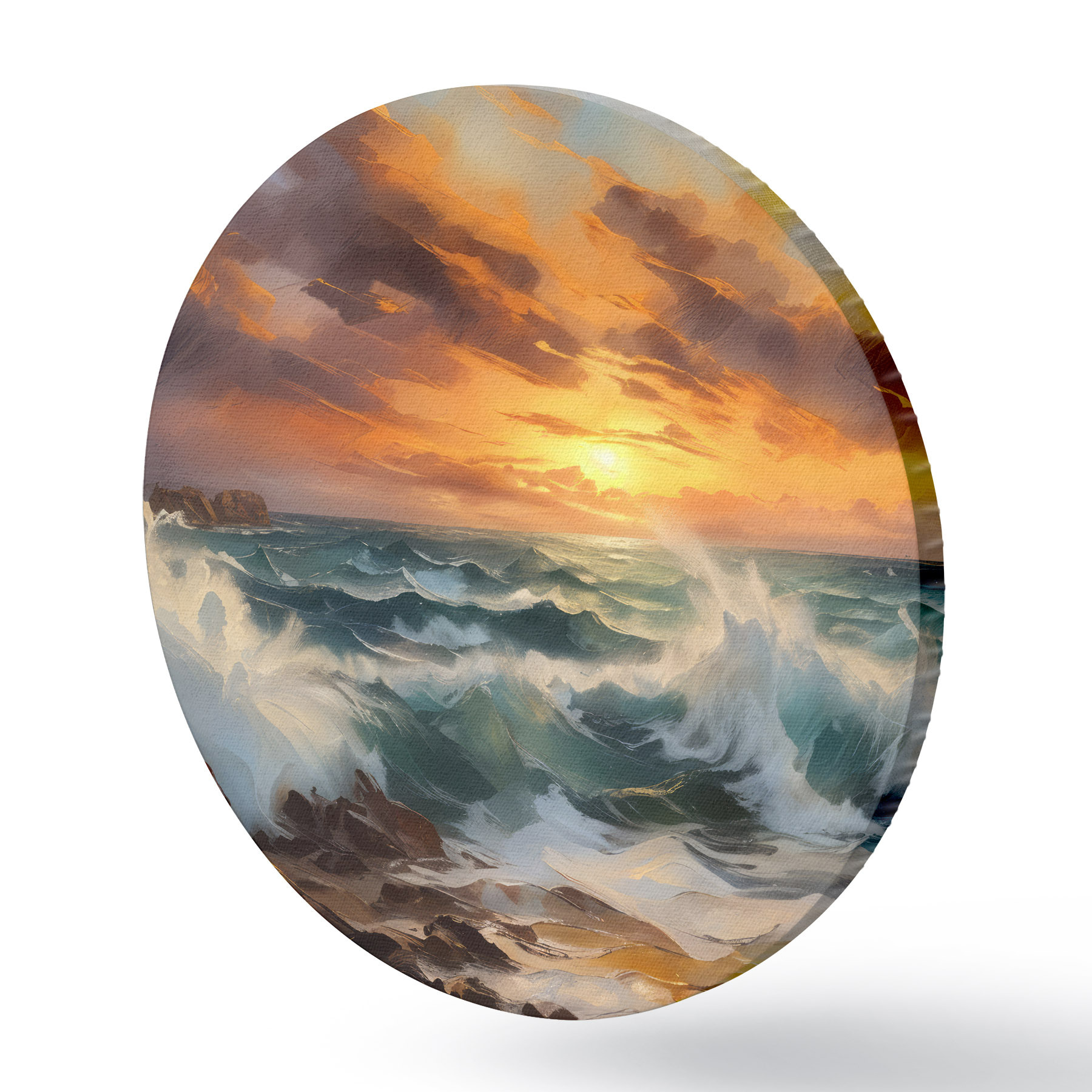 Quadri rotondi Paesaggio marino drammatico con onde che si infrangono e scogliere rocciose, sullo sfondo di un cielo arancione e giallo con nuvole r41266