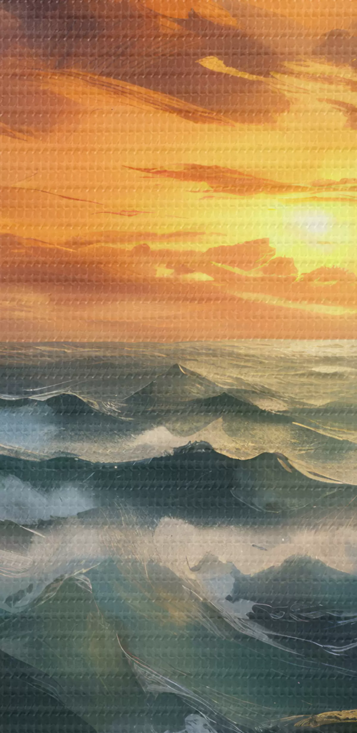 Immagine Paesaggio marino drammatico con onde che si infrangono e scogliere rocciose, sullo sfondo di un cielo arancione e giallo con nuvole Nr r41266