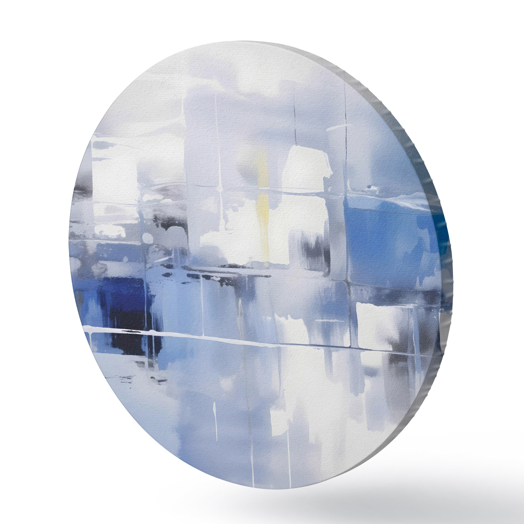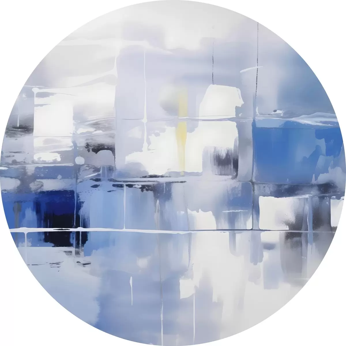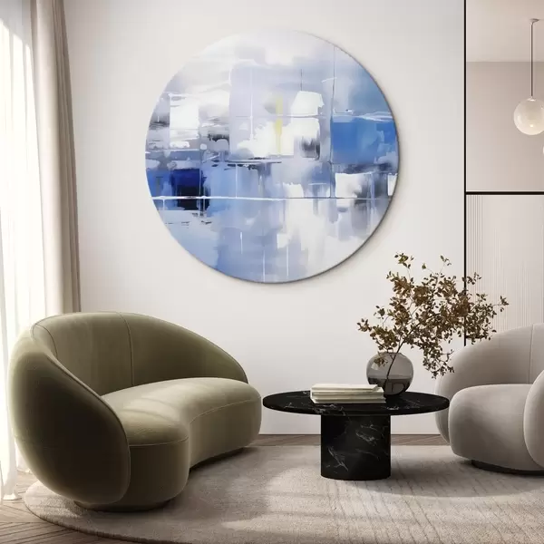 Quadri rotondi Astrazione moderna nei toni del blu, del bianco e del grigio con linee e forme sfocate r41269
