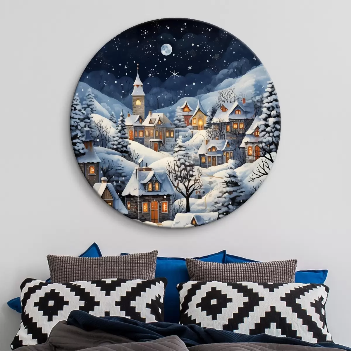 Quadri rotondi Paesaggio invernale con case di campagna innevate sullo sfondo del cielo notturno stellato r41275