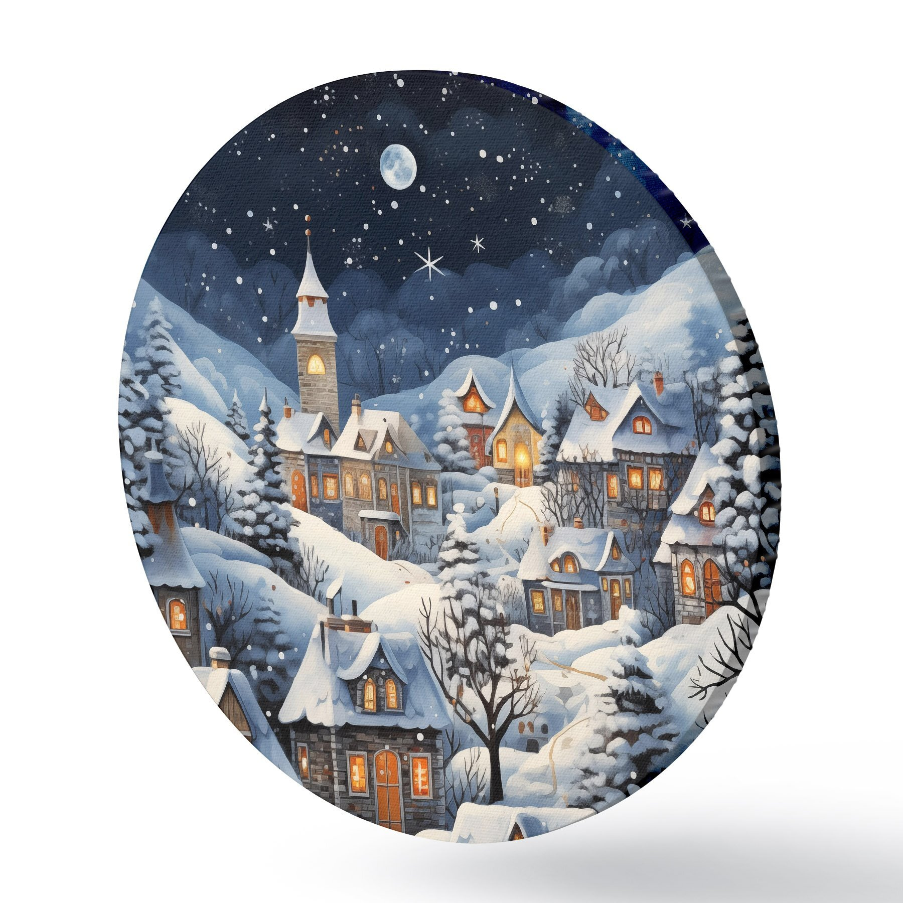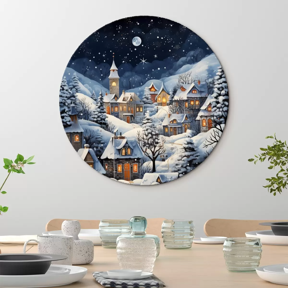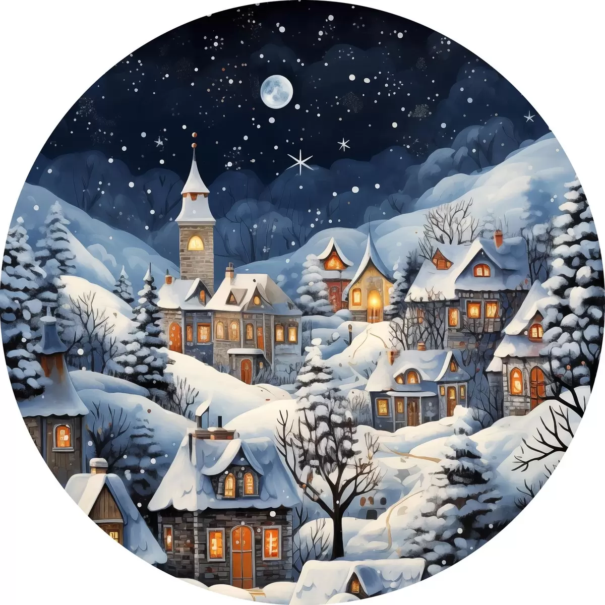Quadri rotondi Paesaggio invernale con case di campagna innevate sullo sfondo del cielo notturno stellato r41275