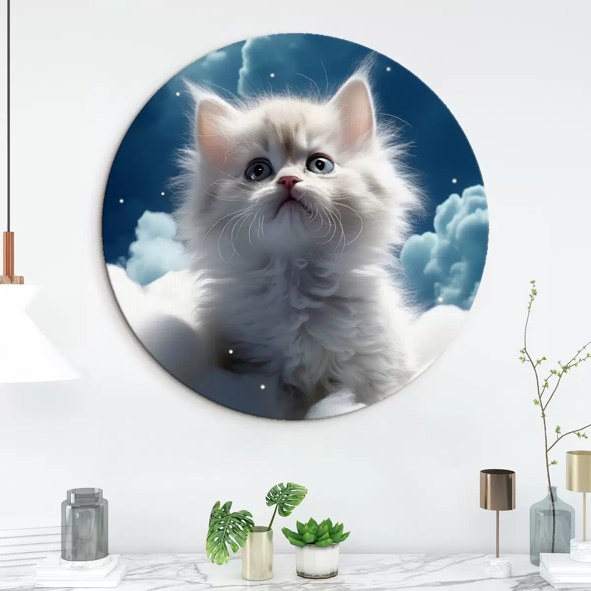 Quadri rotondi Un gattino bianco e soffice nel cielo siede su una nuvola r41279