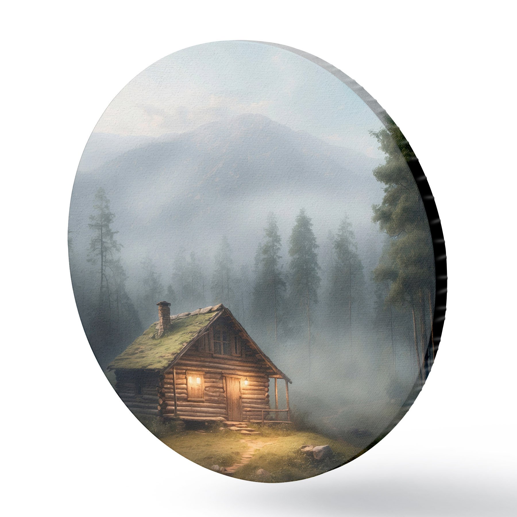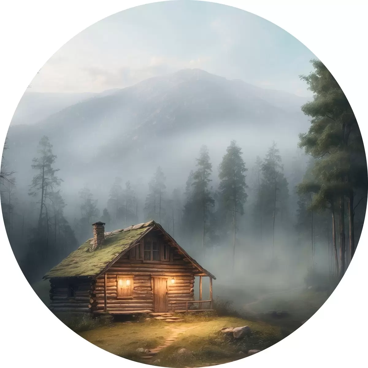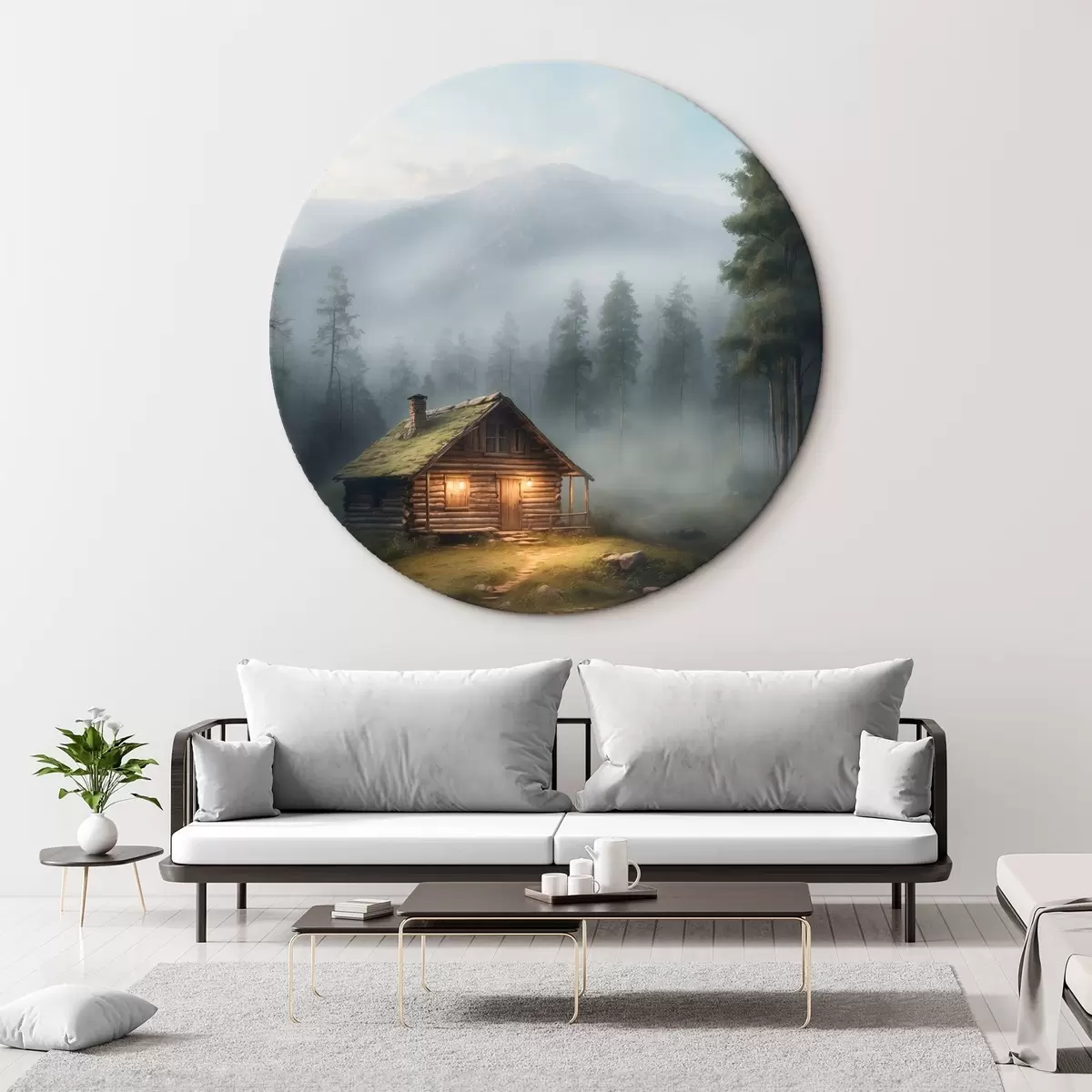 Quadri rotondi Cottage nella foresta nebbiosa r41304