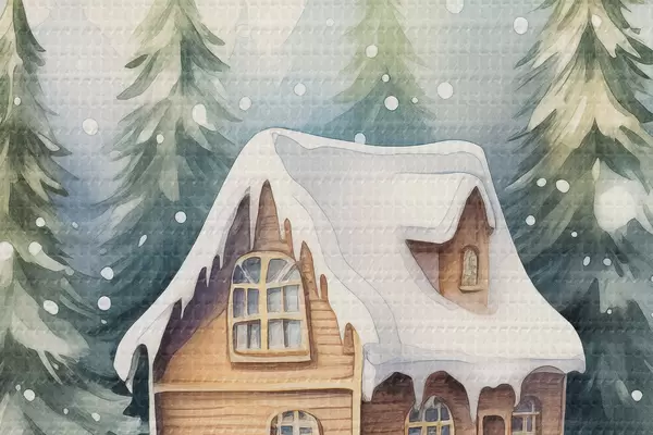 Immagine Sfera di cristallo acquerellata con scenario invernale, casa nel bosco, neve Nr r41366