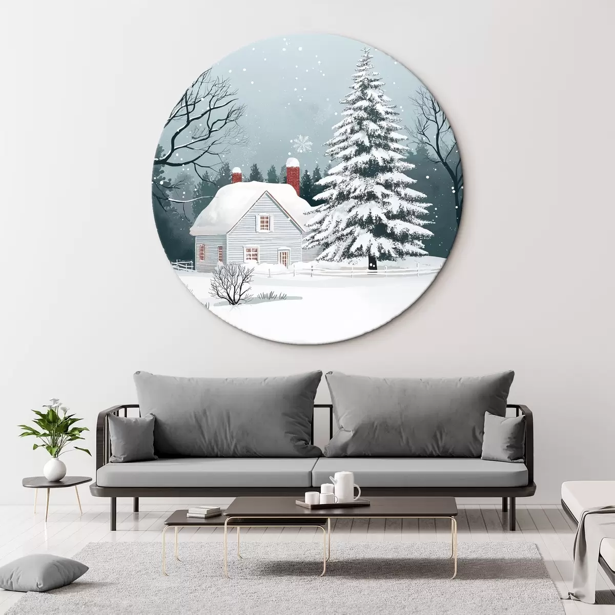 Quadri rotondi Scena invernale con casa coperta di neve, foresta, pini r41369