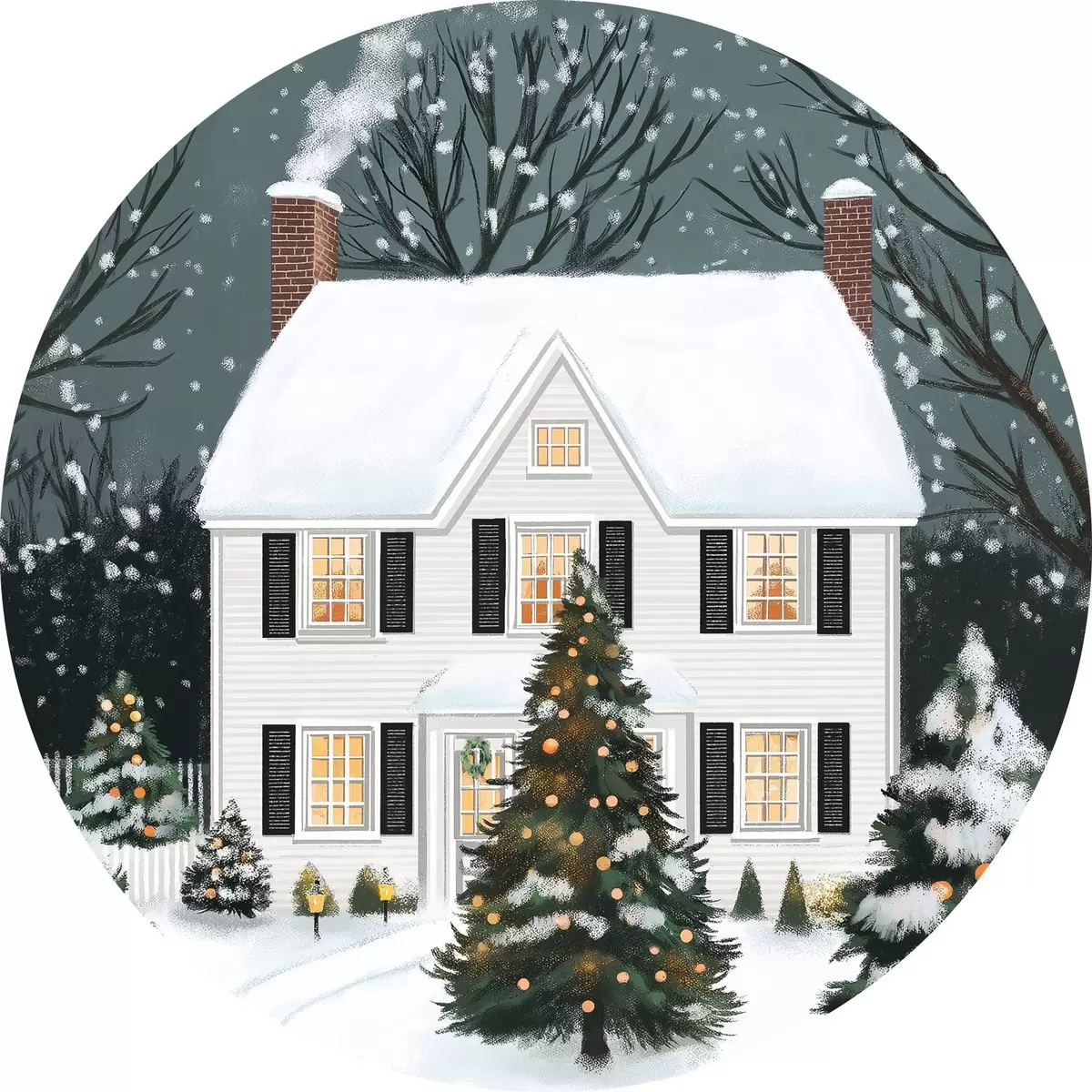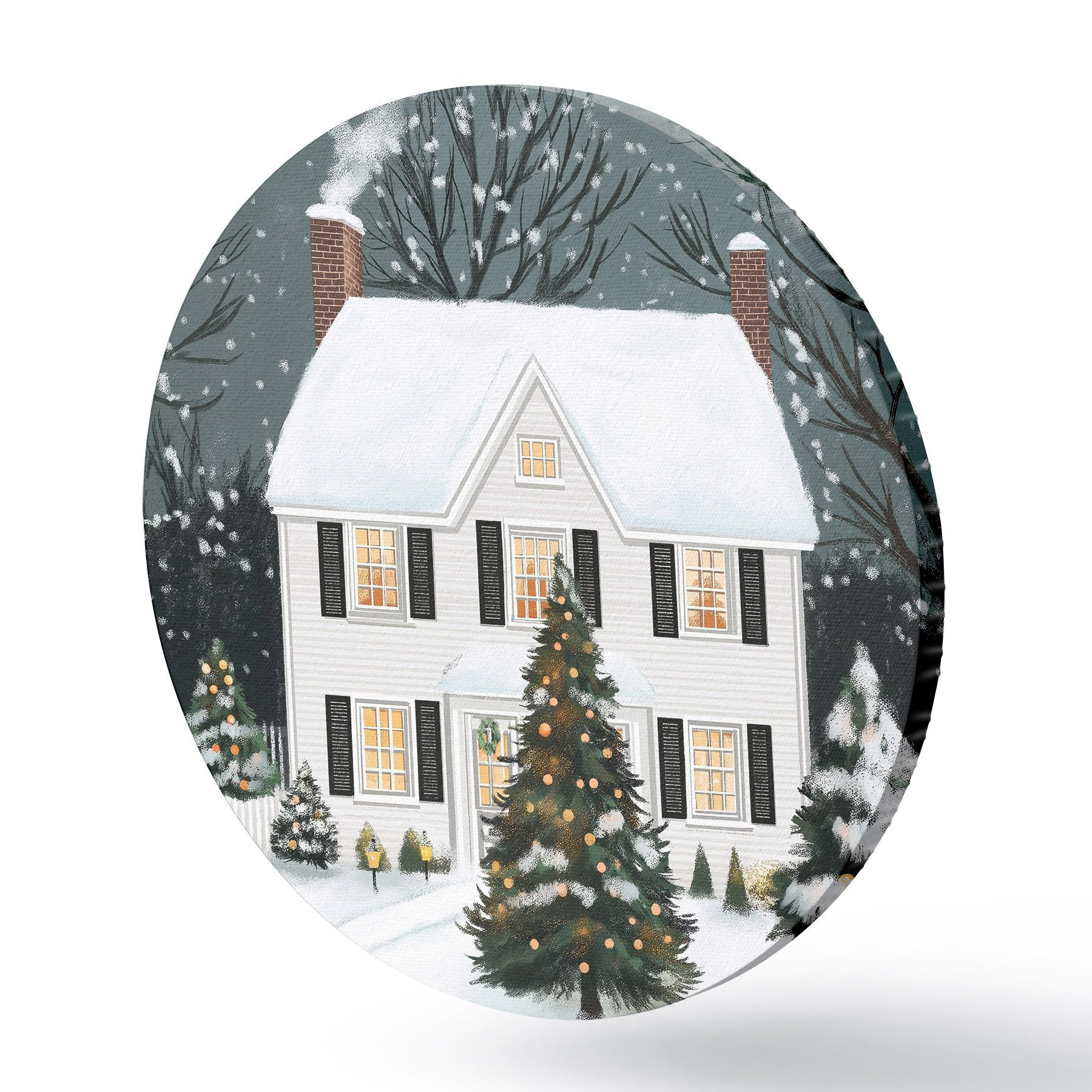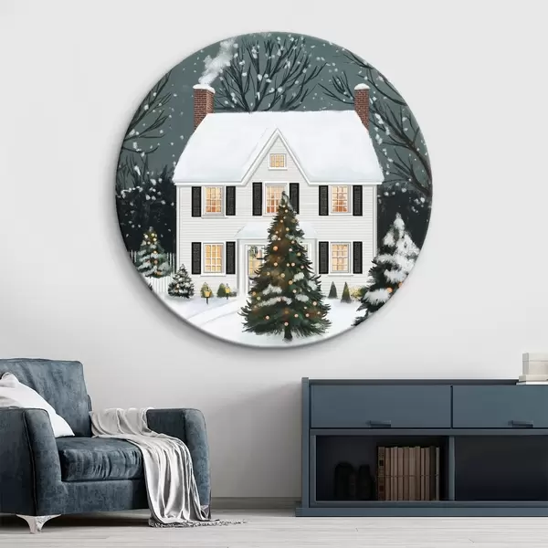 Quadri rotondi Paese delle meraviglie invernale, casa, pini, rustico, paesaggio invernale, foresta r41370