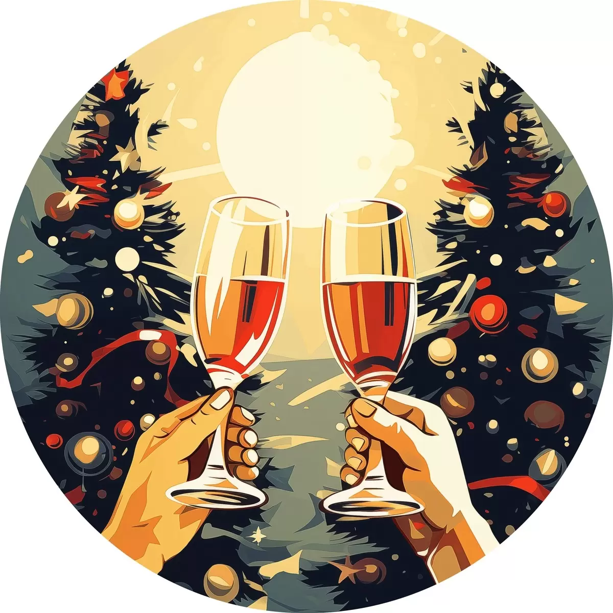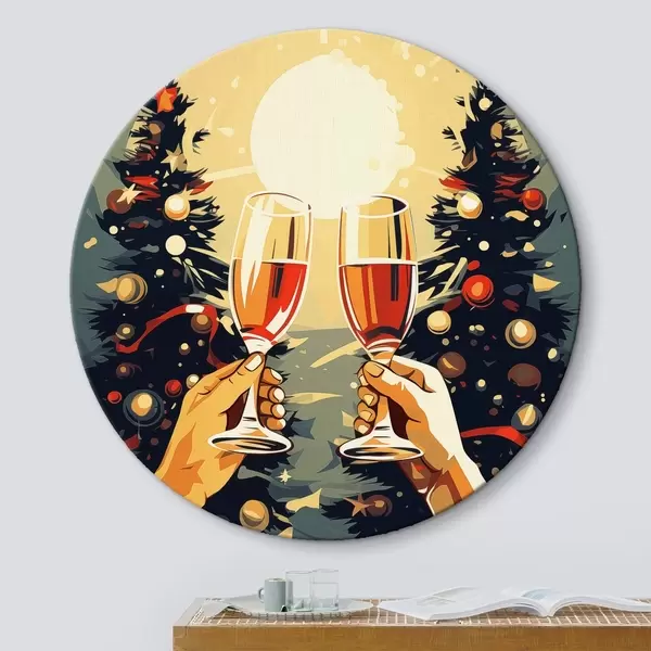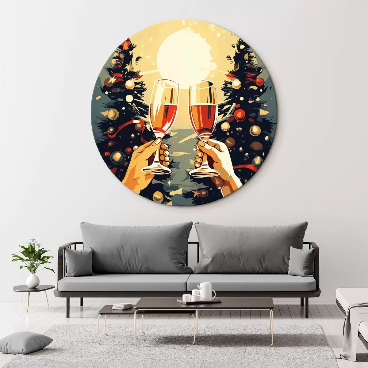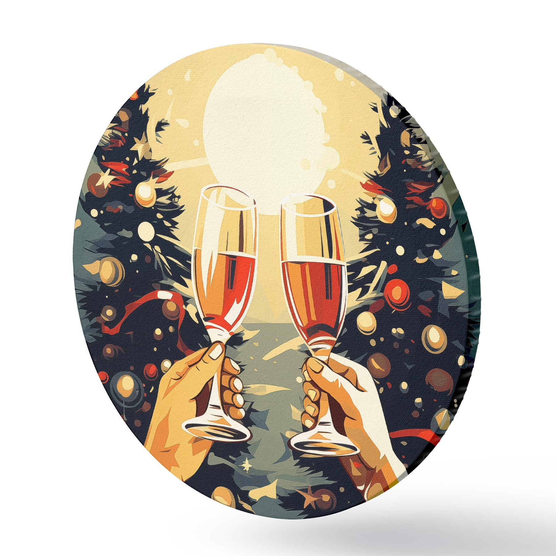 Quadri rotondi Bicchieri con champagne, Natale, Capodanno, astrazione, pop art, alberi di pino r41374