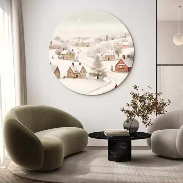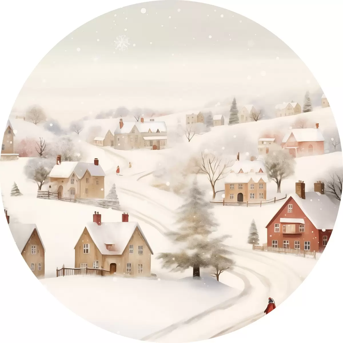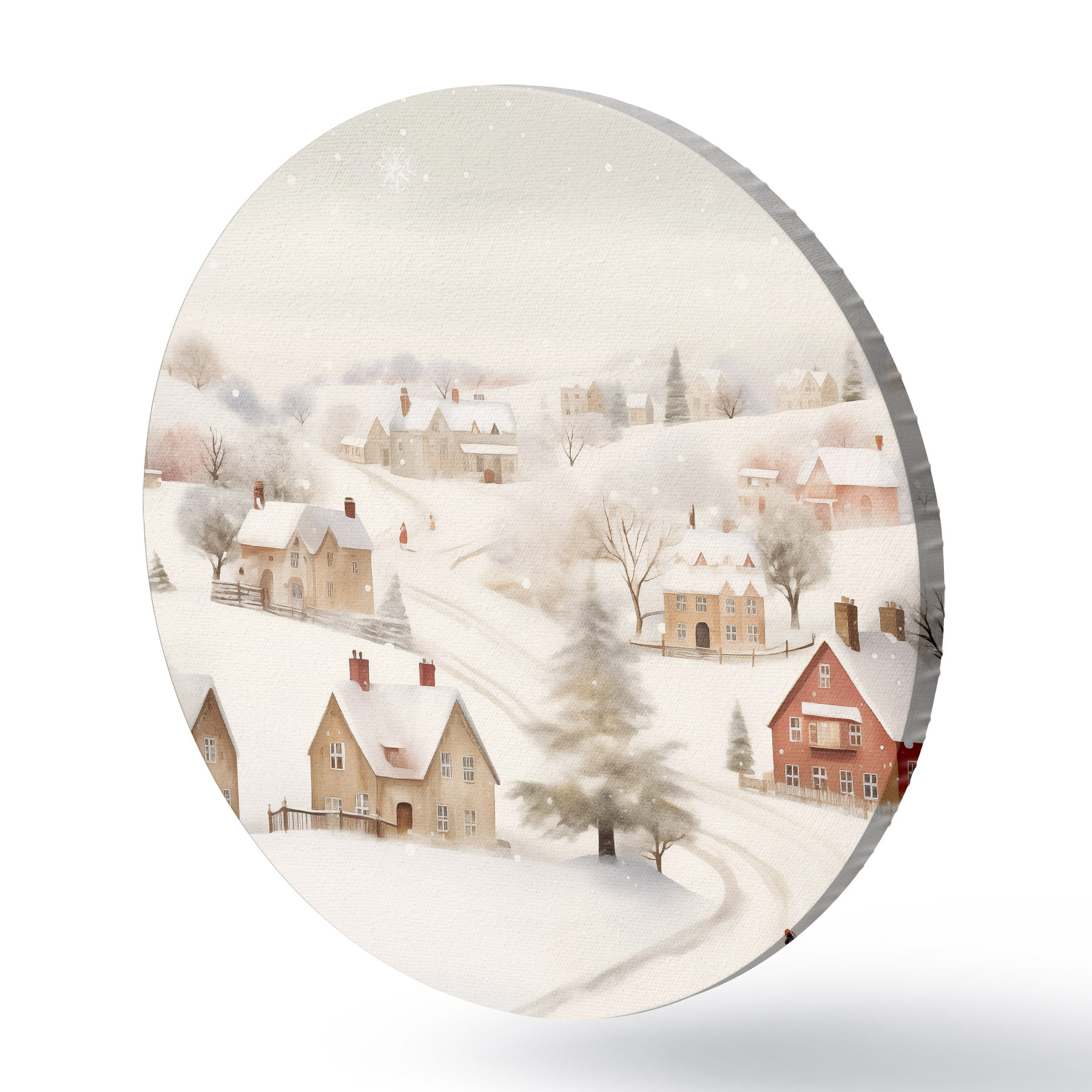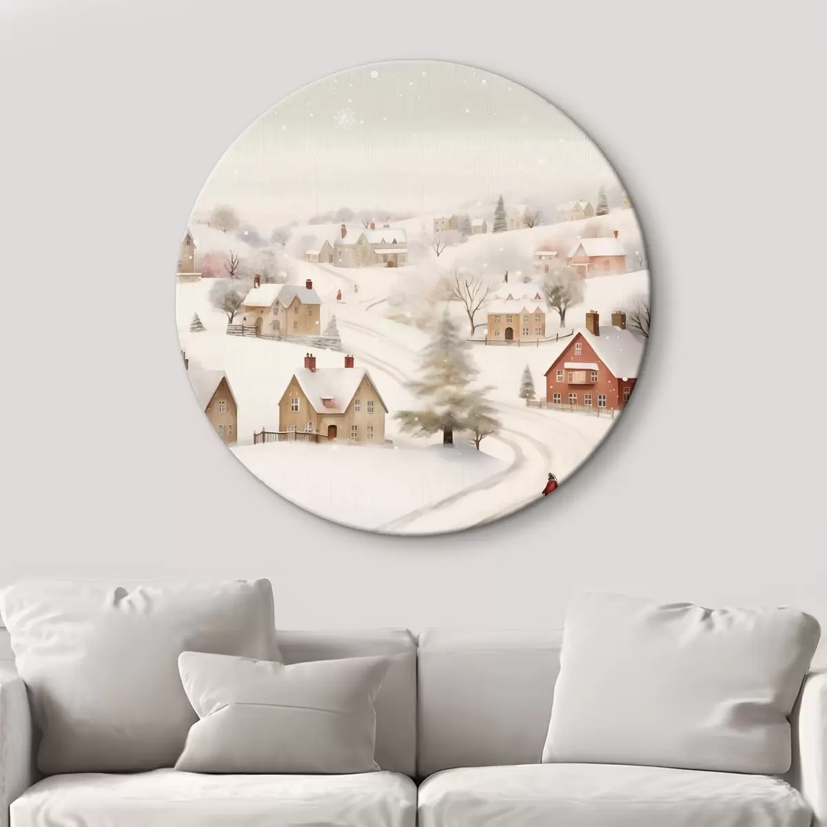 Quadri rotondi Villaggio invernale, acquerello, fiocchi di neve, colori tenui, alberi, paesaggio r41381