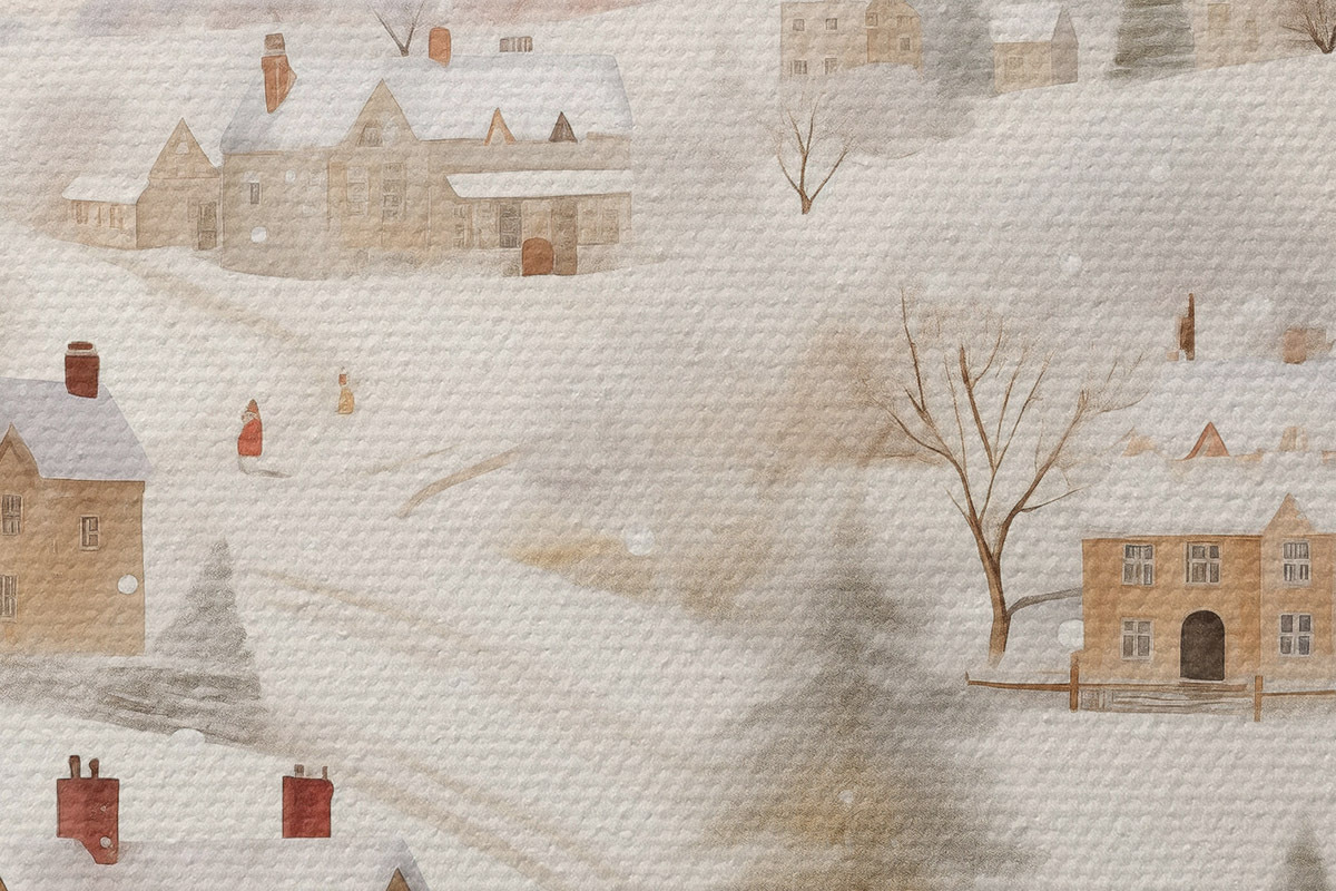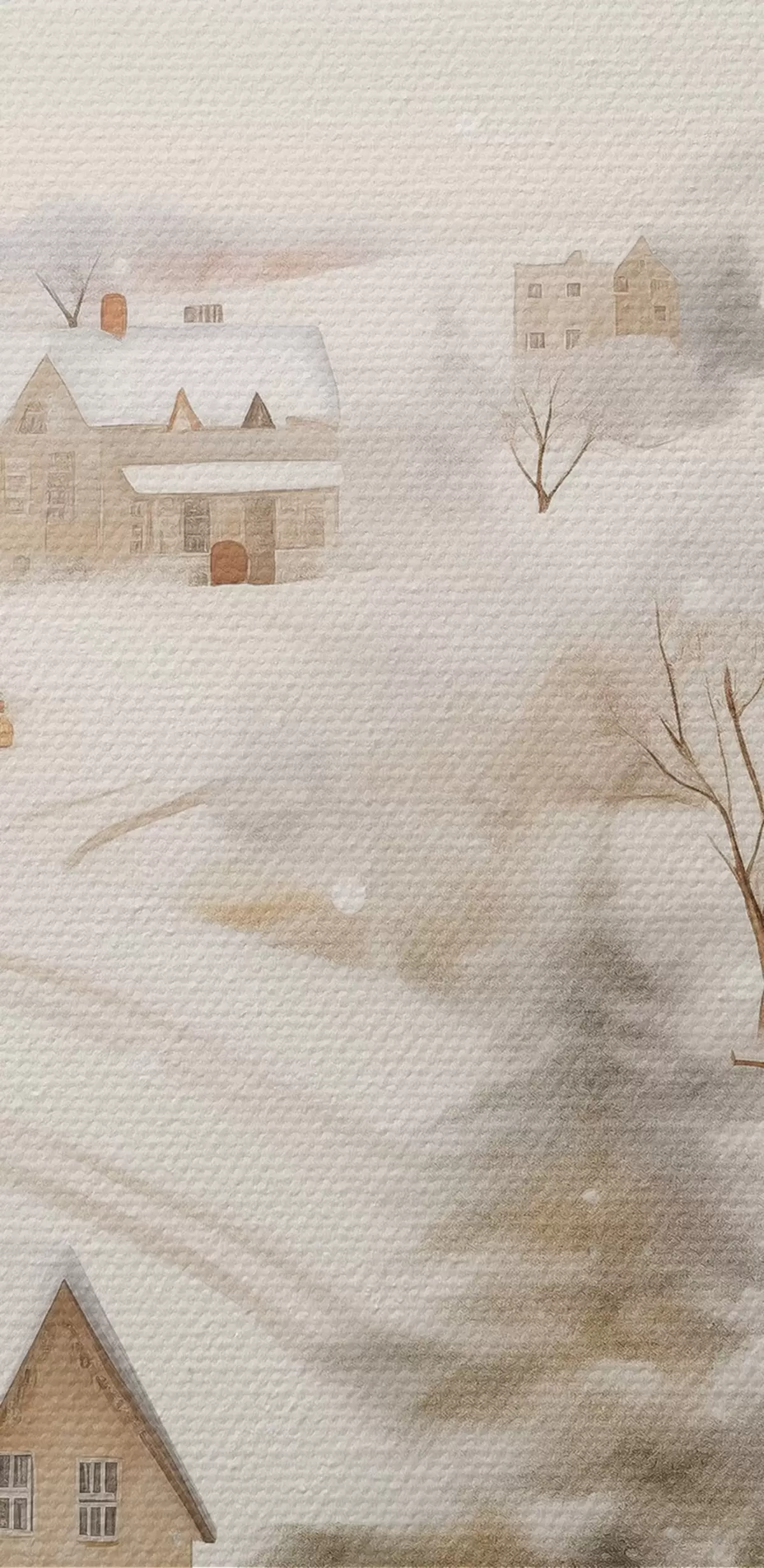 Immagine Villaggio invernale, acquerello, fiocchi di neve, colori tenui, alberi, paesaggio Nr r41381