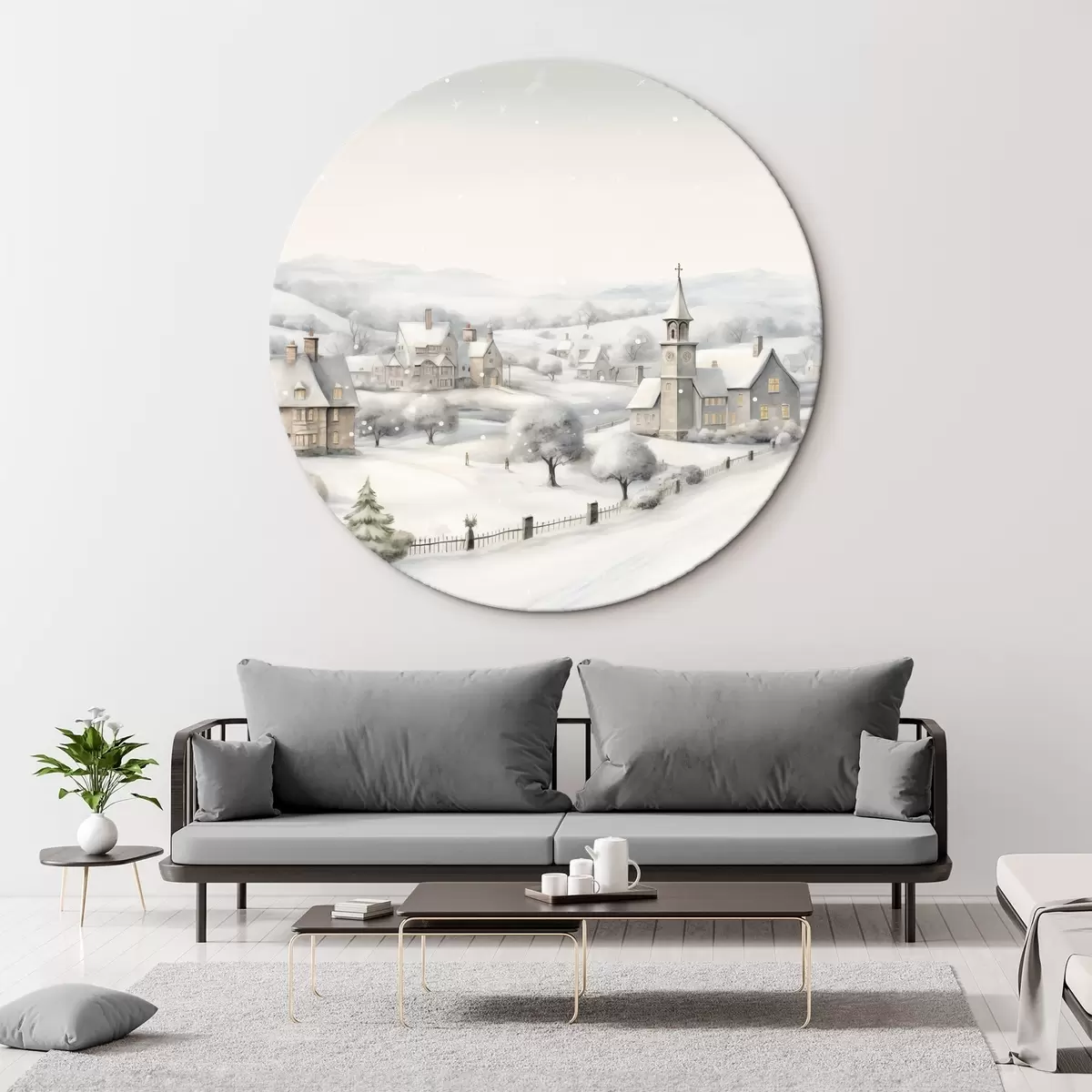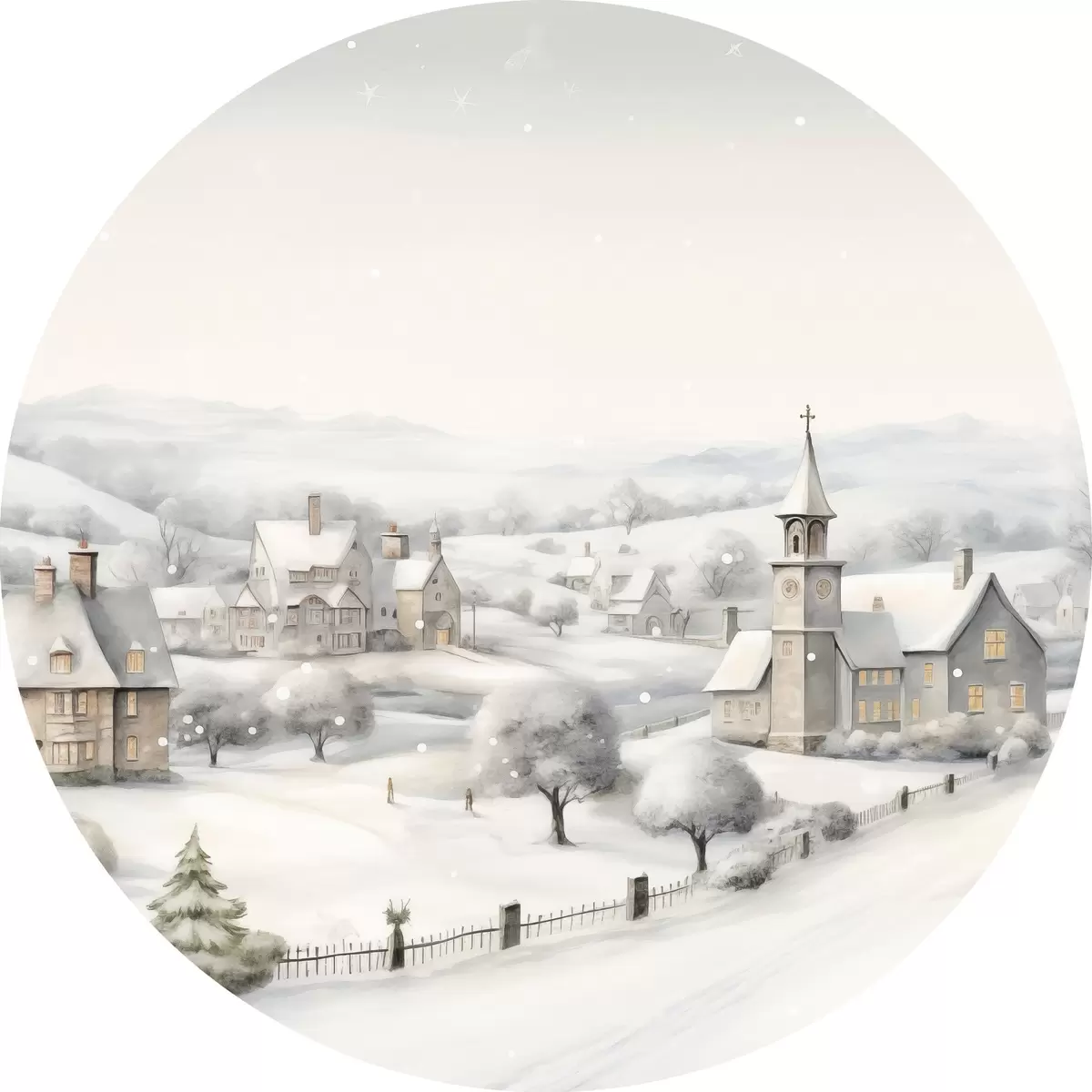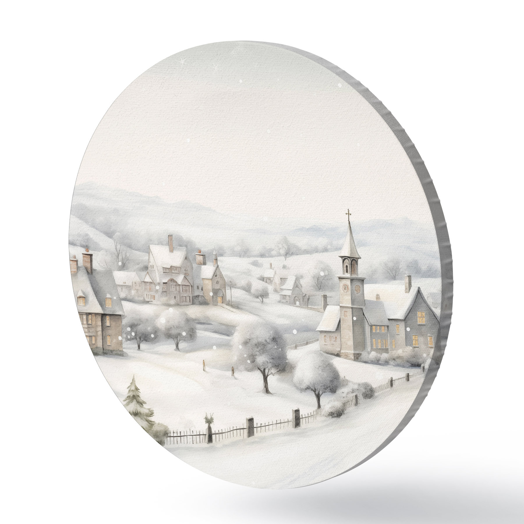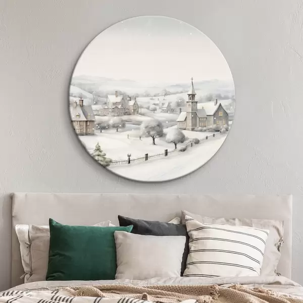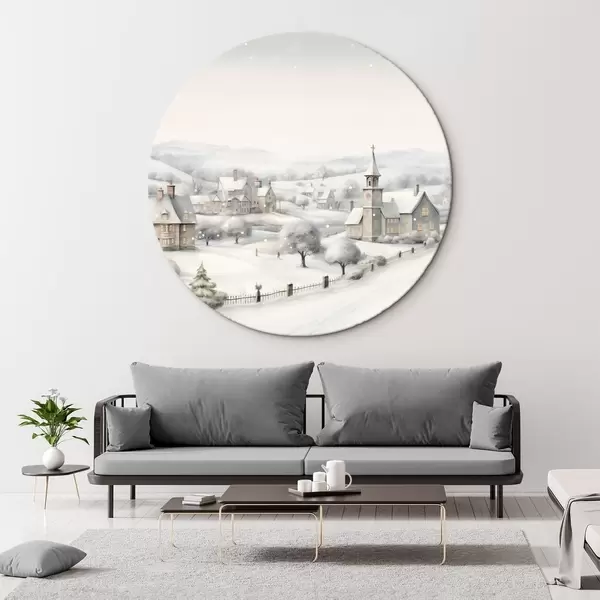 Quadri rotondi Bellissimo villaggio invernale, alberi, case, acquerello, montagne r41382