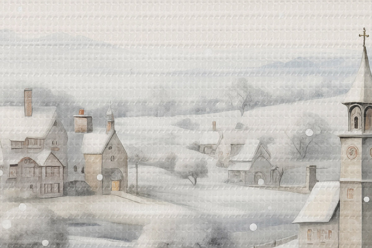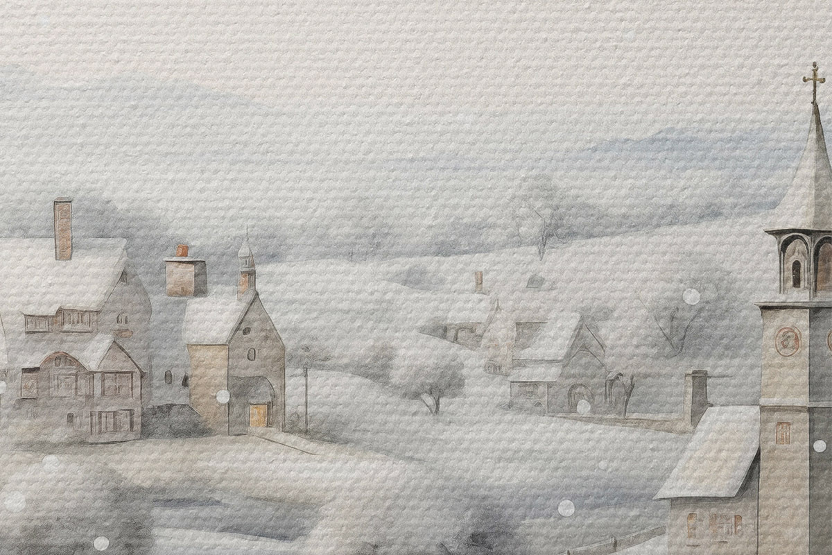 Immagine Bellissimo villaggio invernale, alberi, case, acquerello, montagne Nr r41382