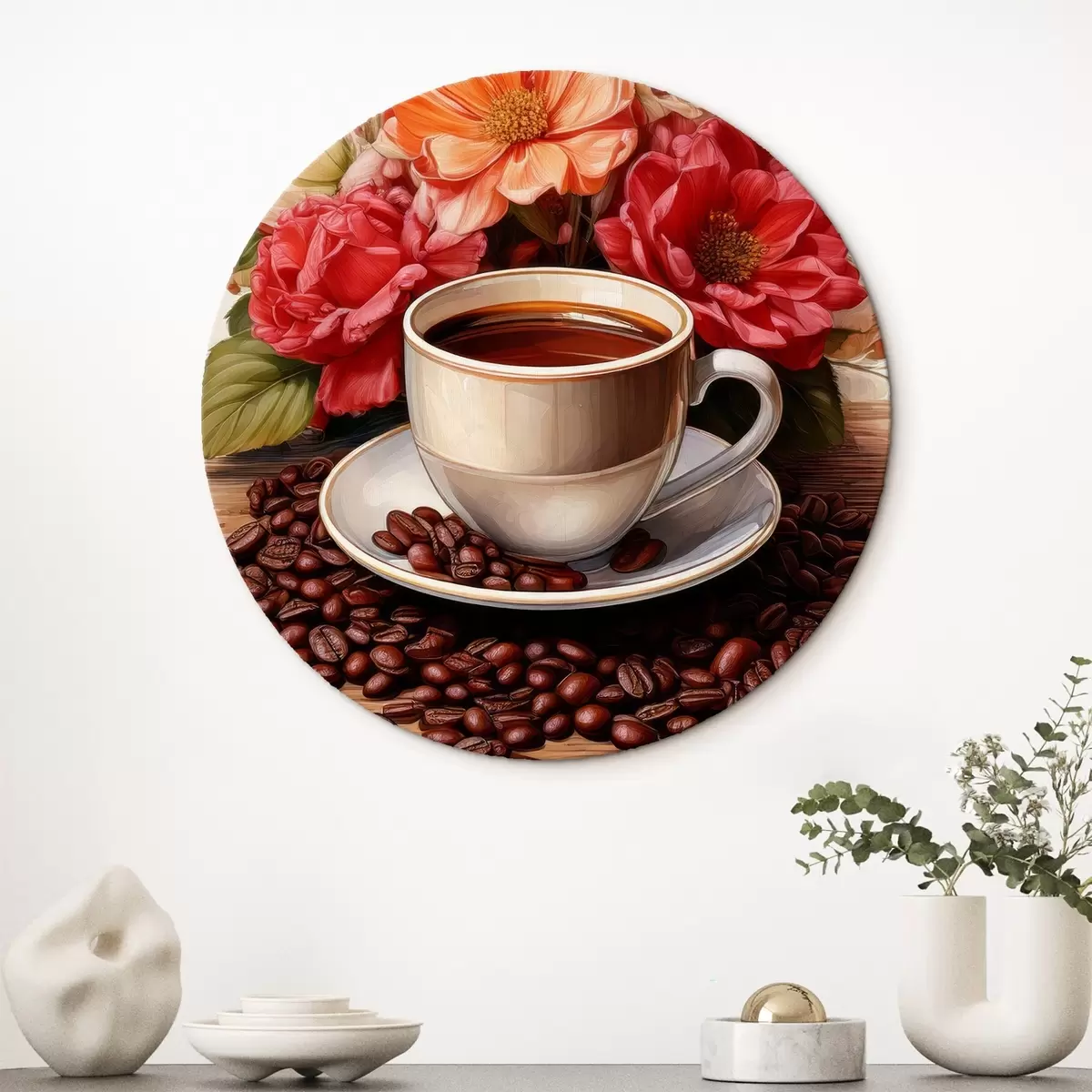 Quadri rotondi una tazza di caffè e un mazzo di fiori r41411
