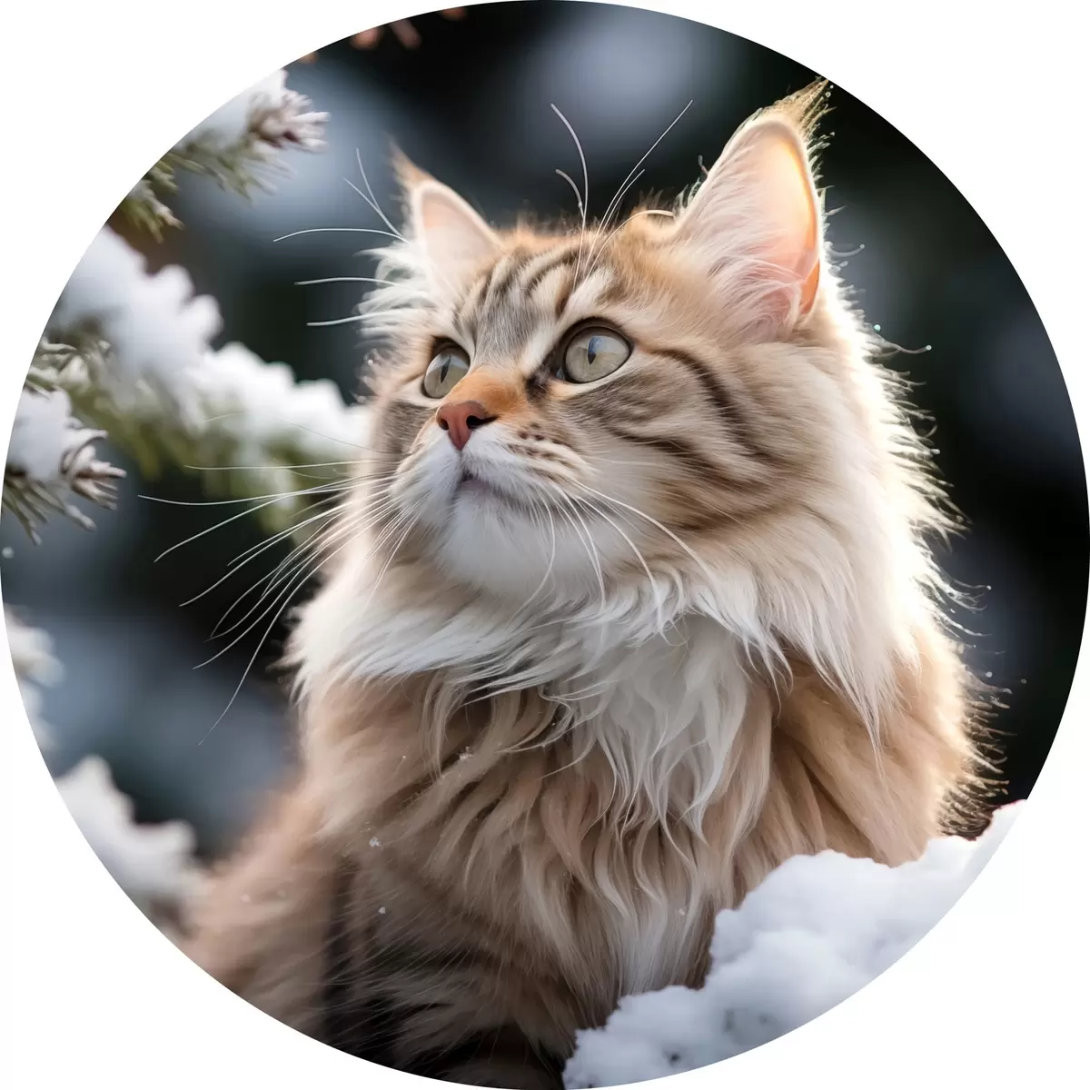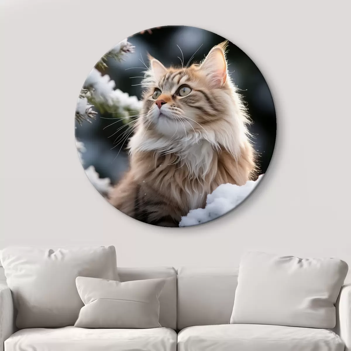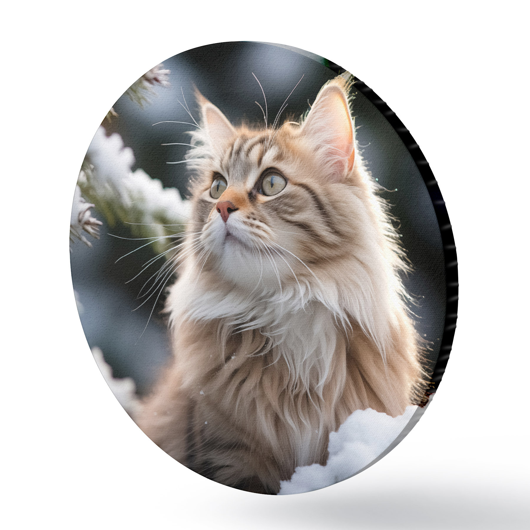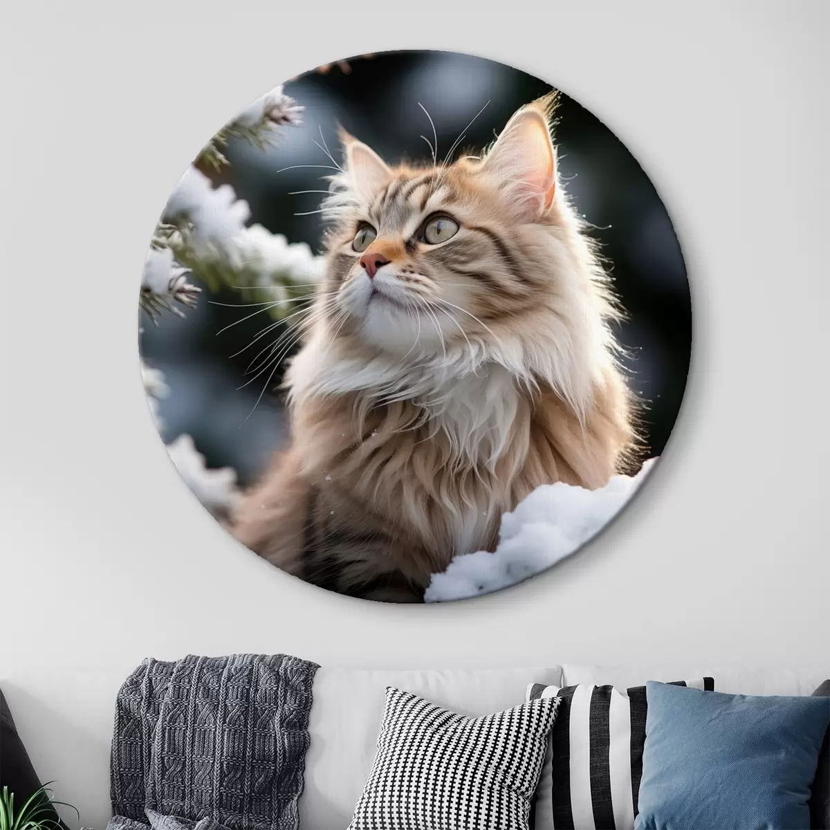 Quadri rotondi Un soffice gatto rossiccio siede vicino alla neve su uno sfondo scuro r41435