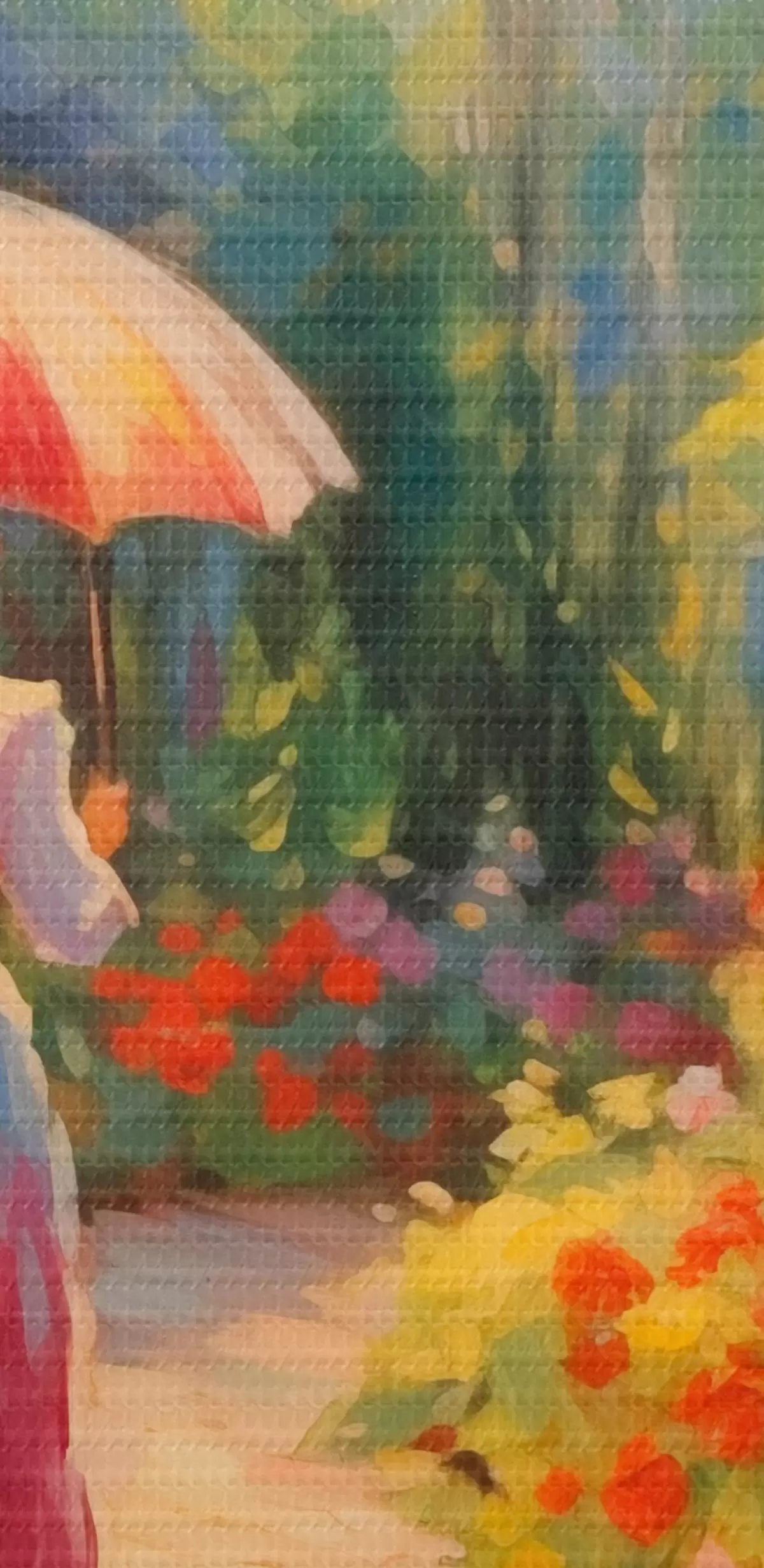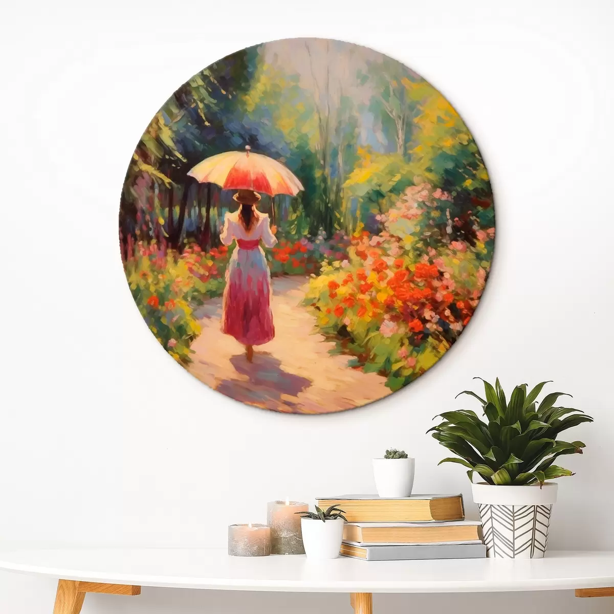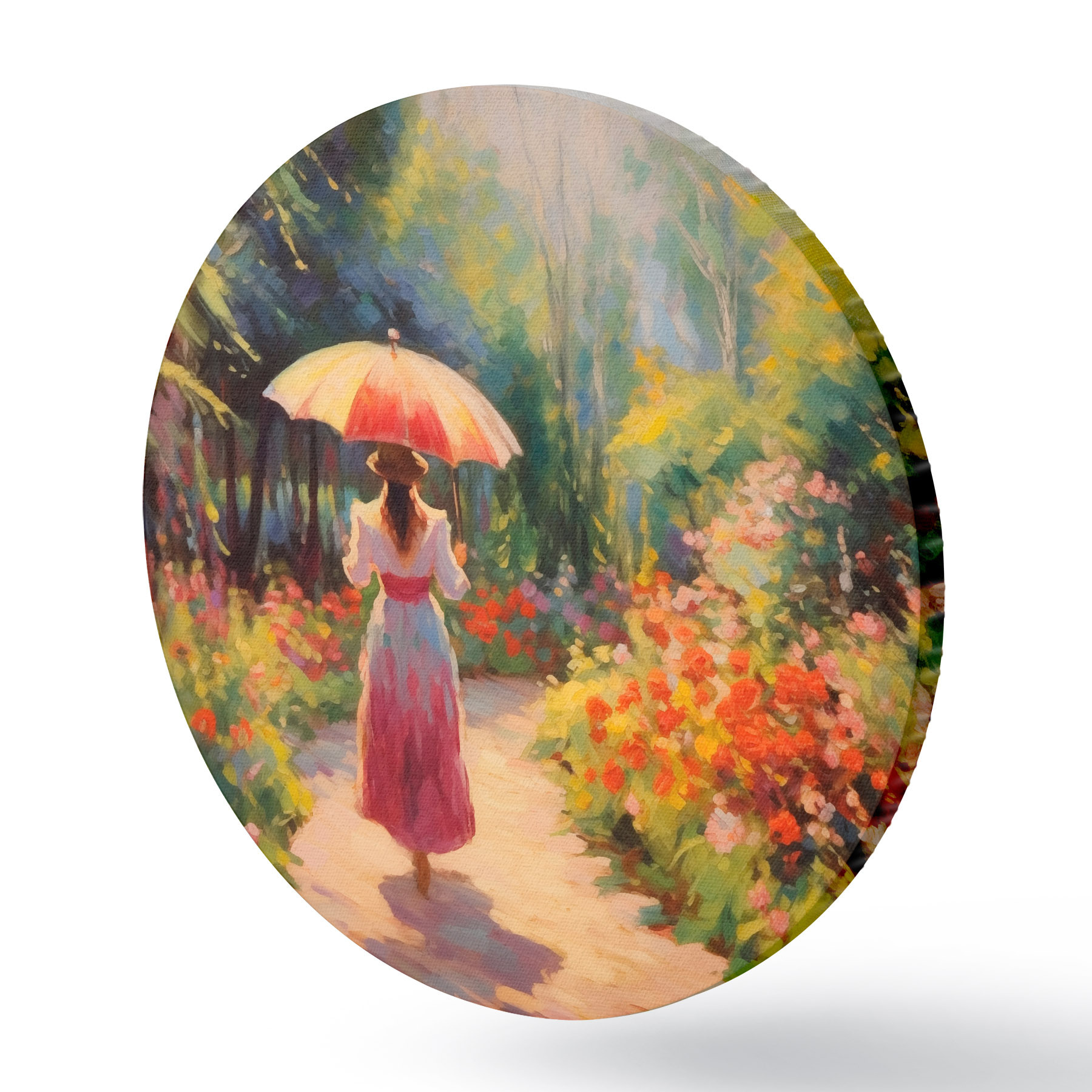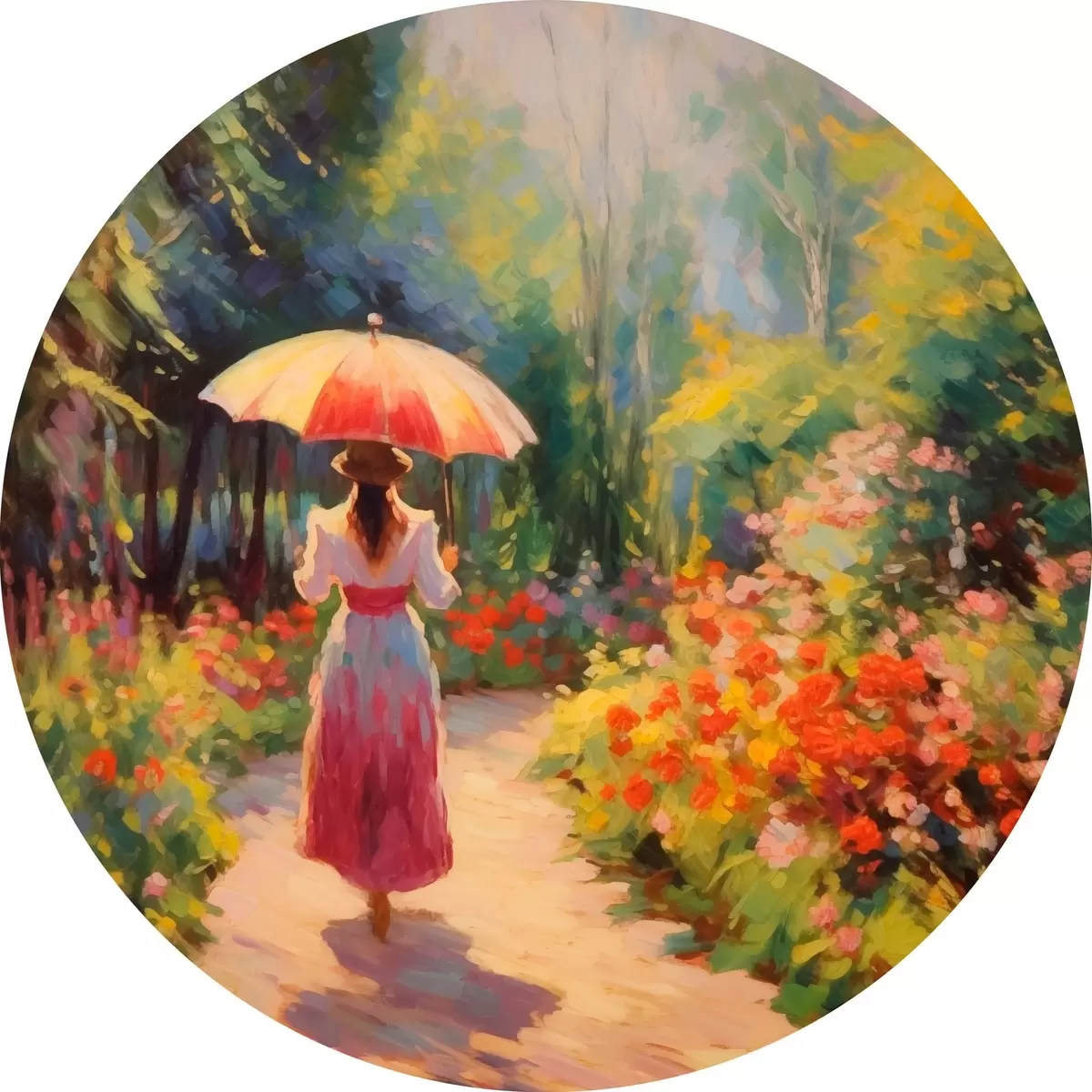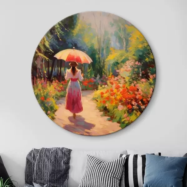 Quadri rotondi Signora con ombrello in un giardino fiorito r41495