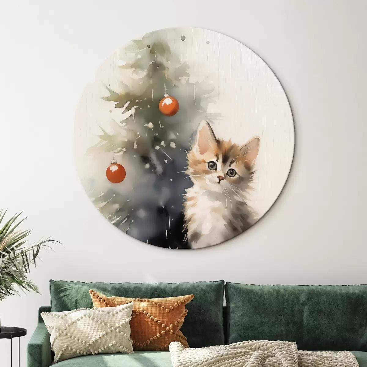 Quadri rotondi Gattino vicino all'albero di Natale imitazione di acquerello bagnato r42140