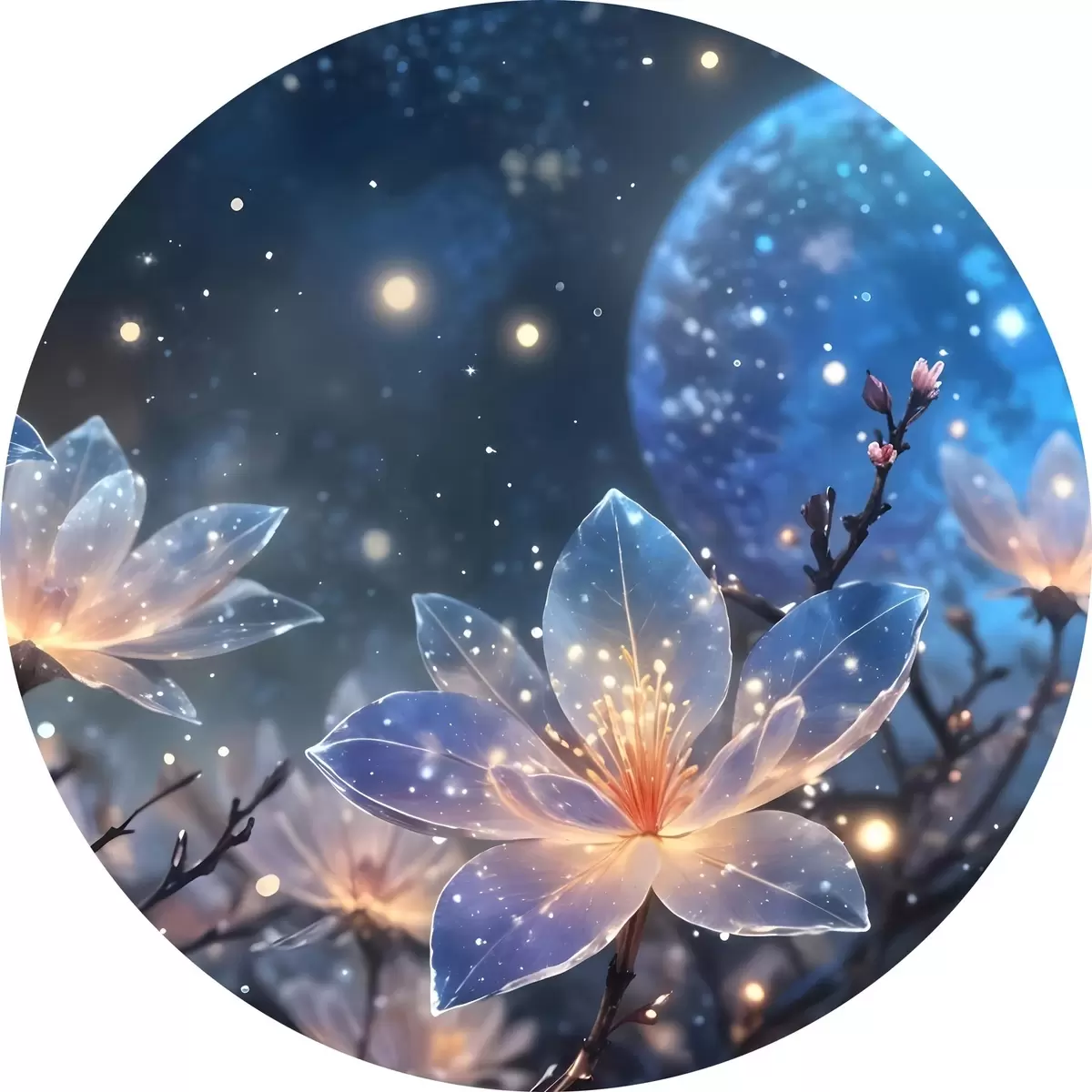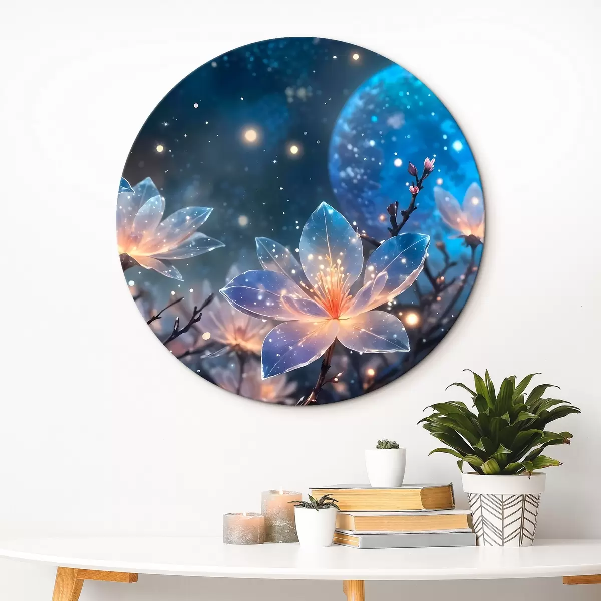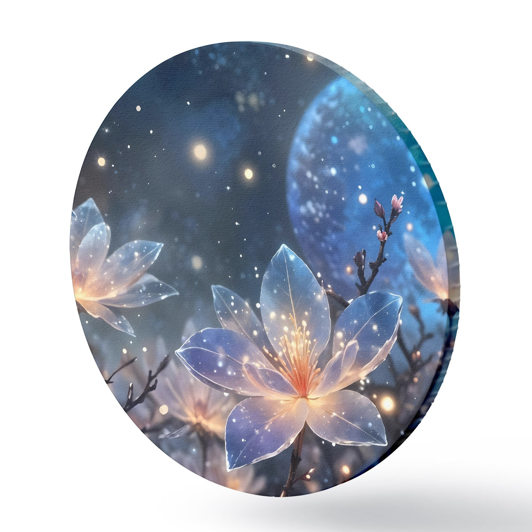 Quadri rotondi Fiori astratti di fantasia su rami con petali strutturati con stelle e luna in uno sfondo di cielo notturno r42211