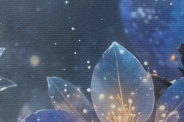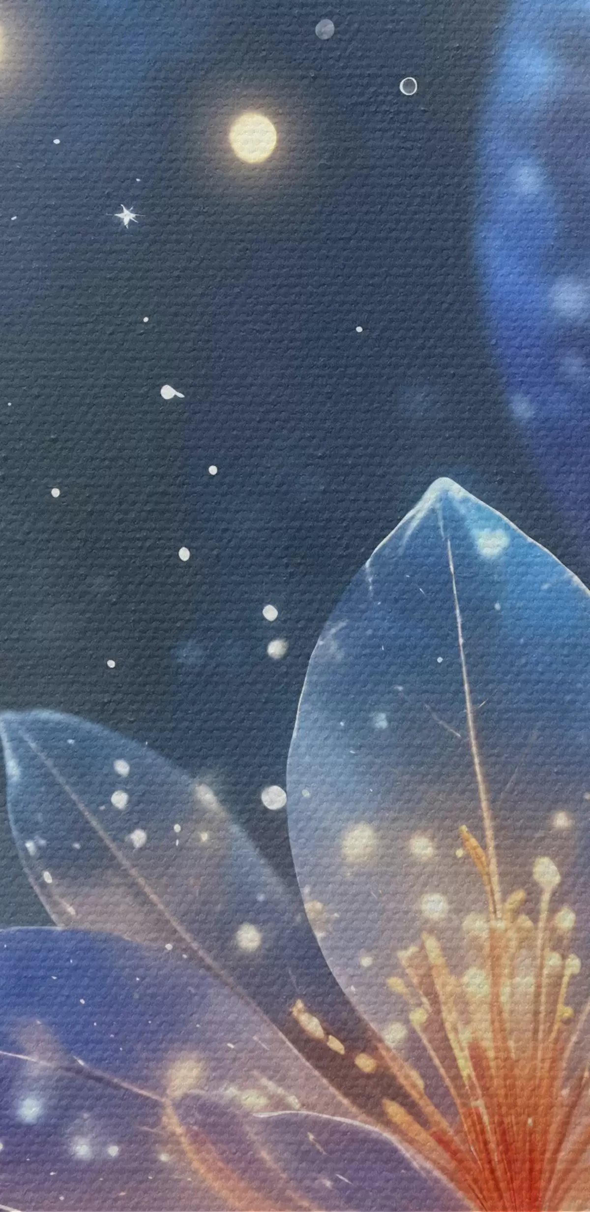 Immagine Fiori astratti di fantasia su rami con petali strutturati con stelle e luna in uno sfondo di cielo notturno Nr r42211