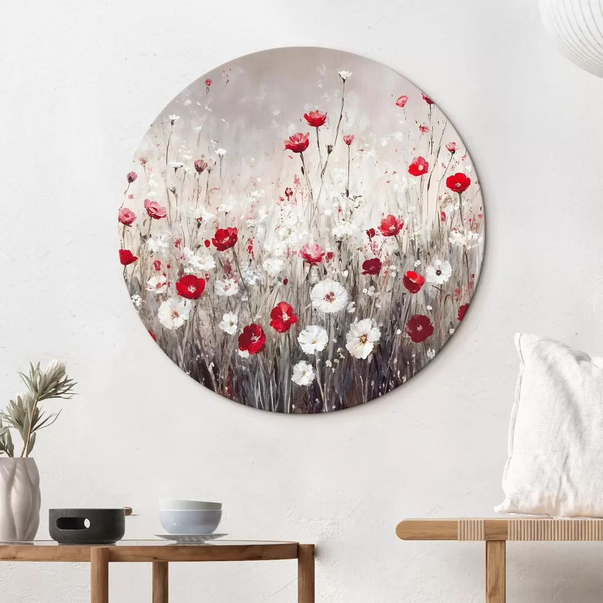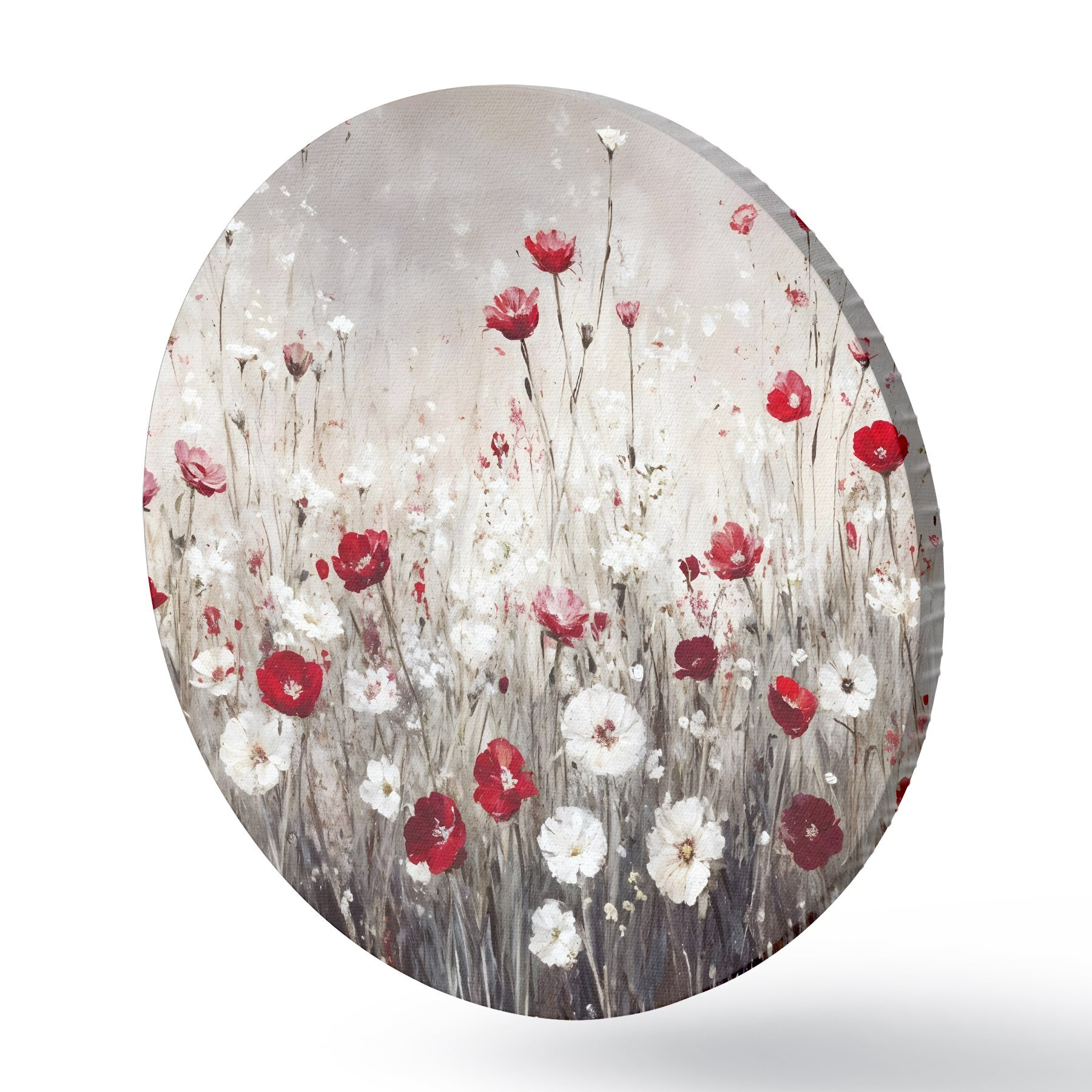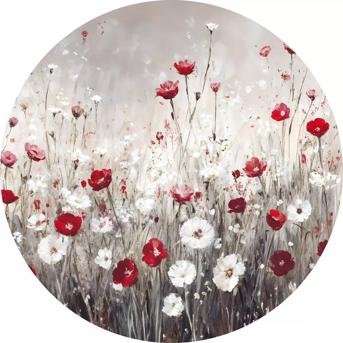 Quadri rotondi Imitazione astratta di pittura a olio di un campo di papaveri e margherite rosse e bianche su uno sfondo grigio e materico r42213