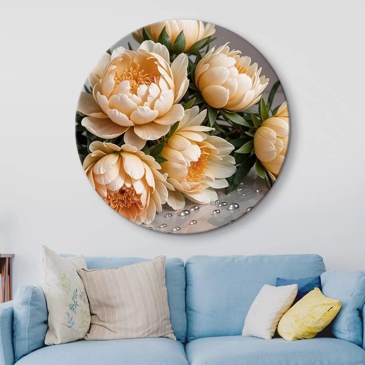 Quadri rotondi Fiori di peonia dettagliati color crema con foglie verde scuro su sfondo grigio r42215
