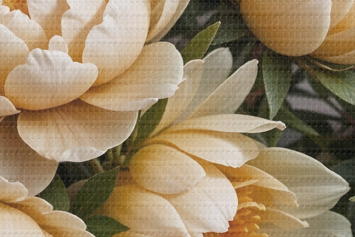 Immagine Fiori di peonia dettagliati color crema con foglie verde scuro su sfondo grigio Nr r42215