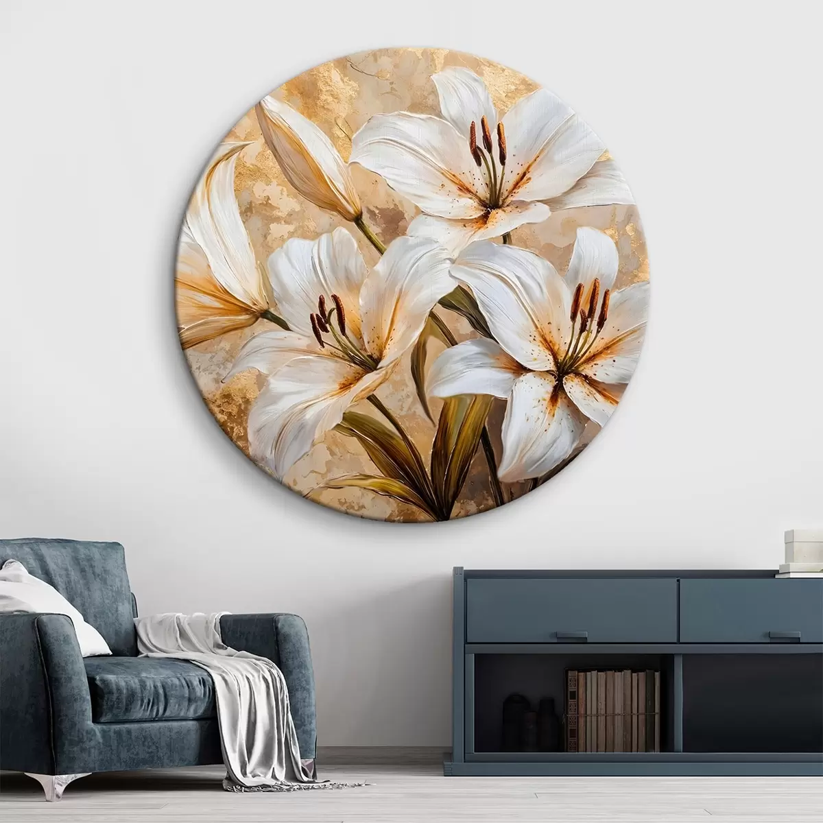 Quadri rotondi Gigli bianchi con centro giallo su sfondo beige strutturato r42216