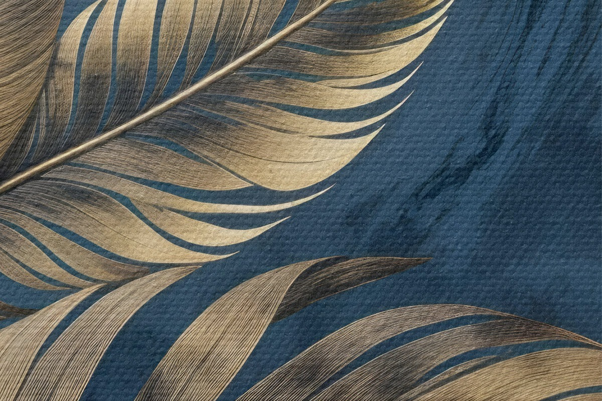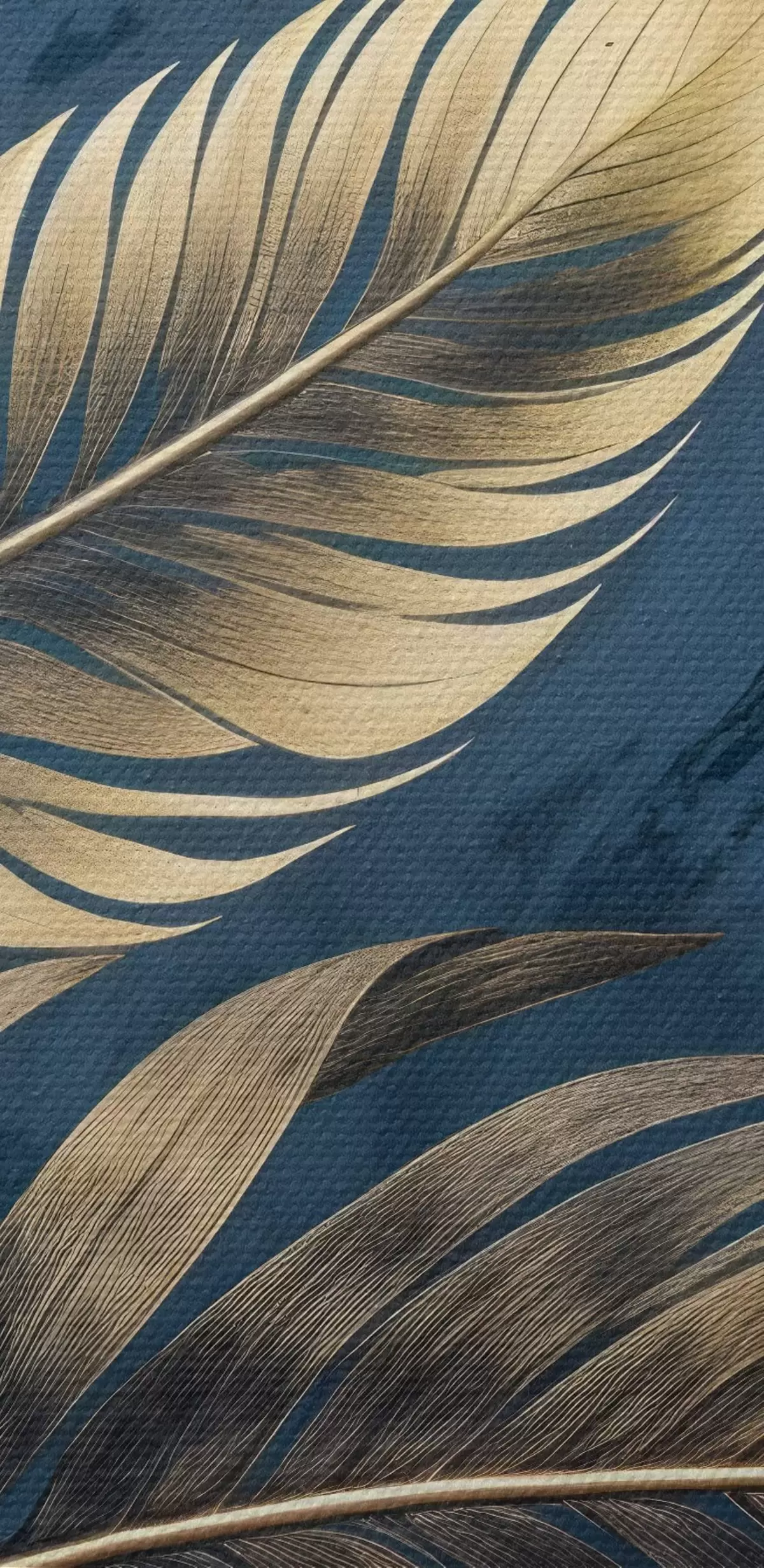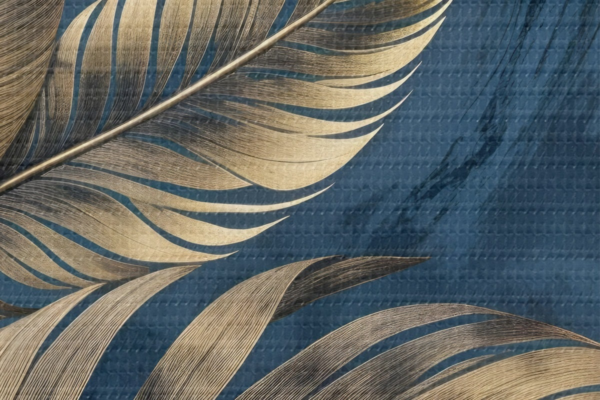 Immagine Piume decorative astratte gialle e beige che fluttuano su uno sfondo testurizzato blu scuro Nr r42218
