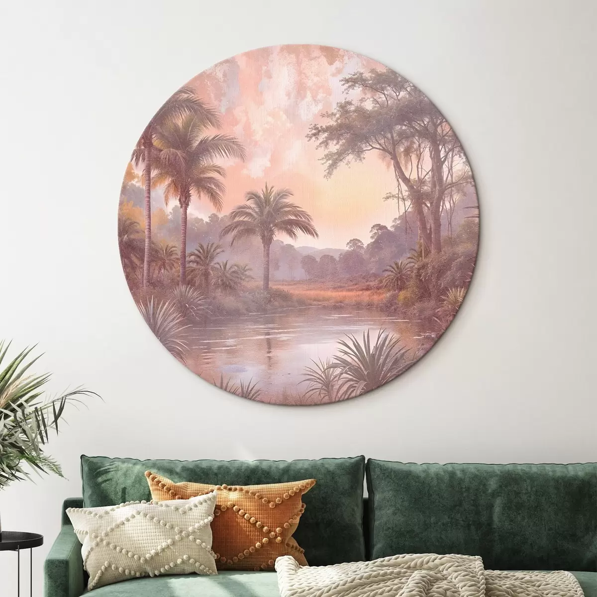 Quadri rotondi Un paesaggio tropicale con un lago sereno circondato da palme lussureggianti e altro fogliame r42219