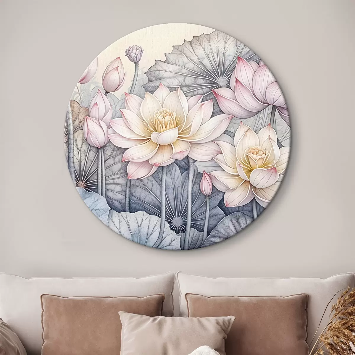 Quadri rotondi Grandi fiori di loto rosa e bianchi con foglie e steli verdi su sfondo chiaro con petali e centri dettagliati r42221