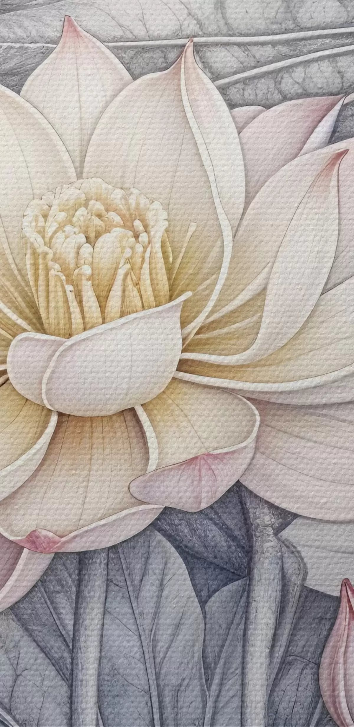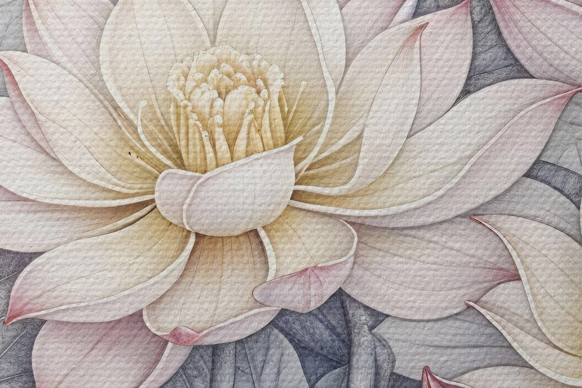 Immagine Grandi fiori di loto rosa e bianchi con foglie e steli verdi su sfondo chiaro con petali e centri dettagliati Nr r42221