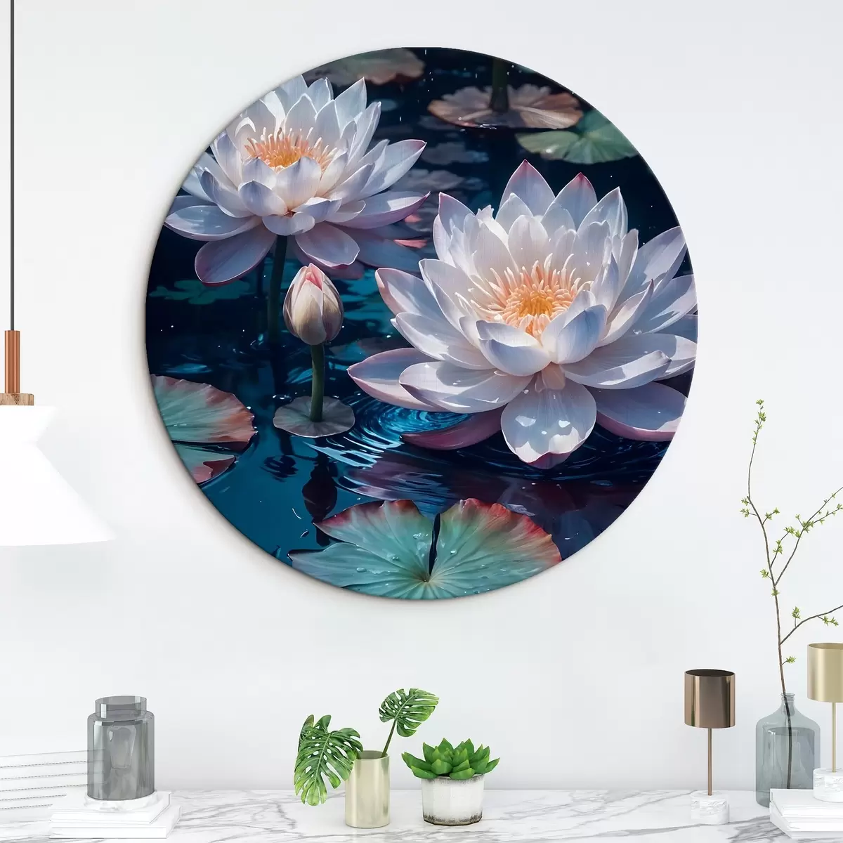 Quadri rotondi Fiori di loto bianchi che galleggiano su uno stagno tranquillo con ninfee r42225