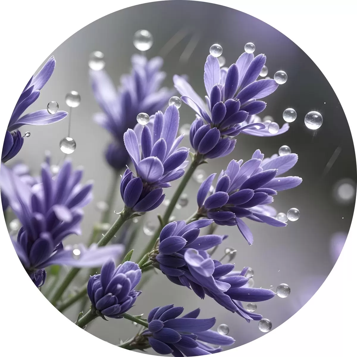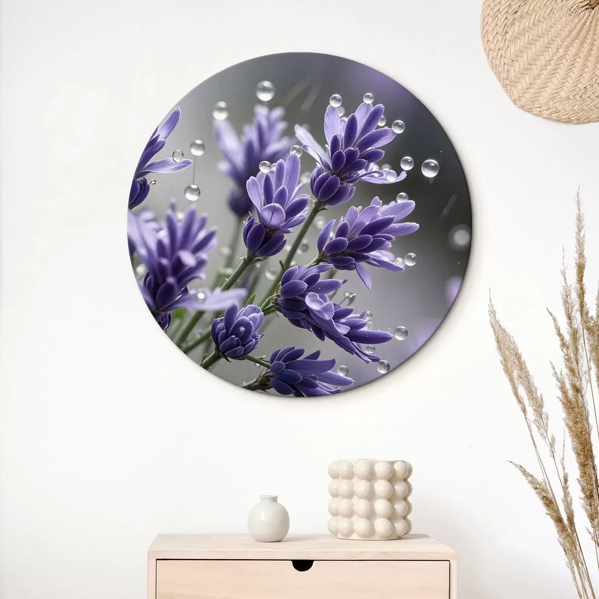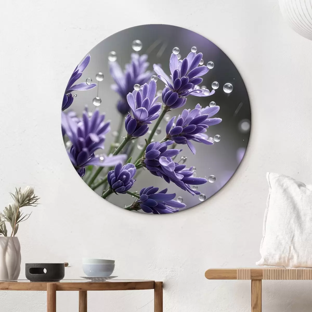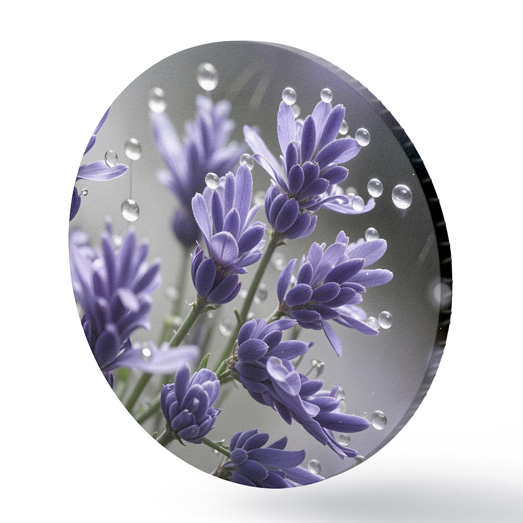 Quadri rotondi Fiori di lavanda viola con gocce d'acqua sui petali, su sfondo sfocato r42229