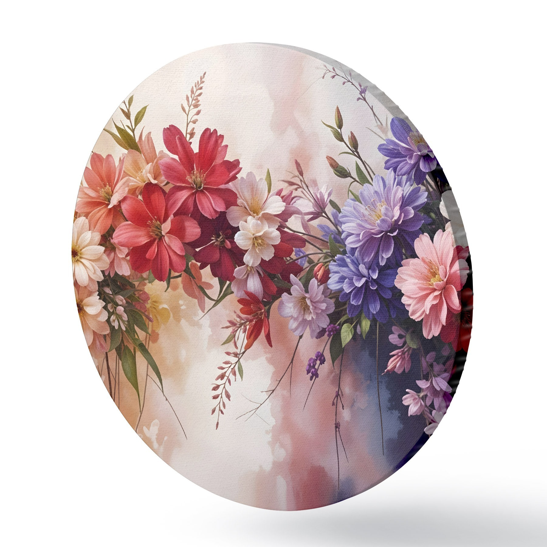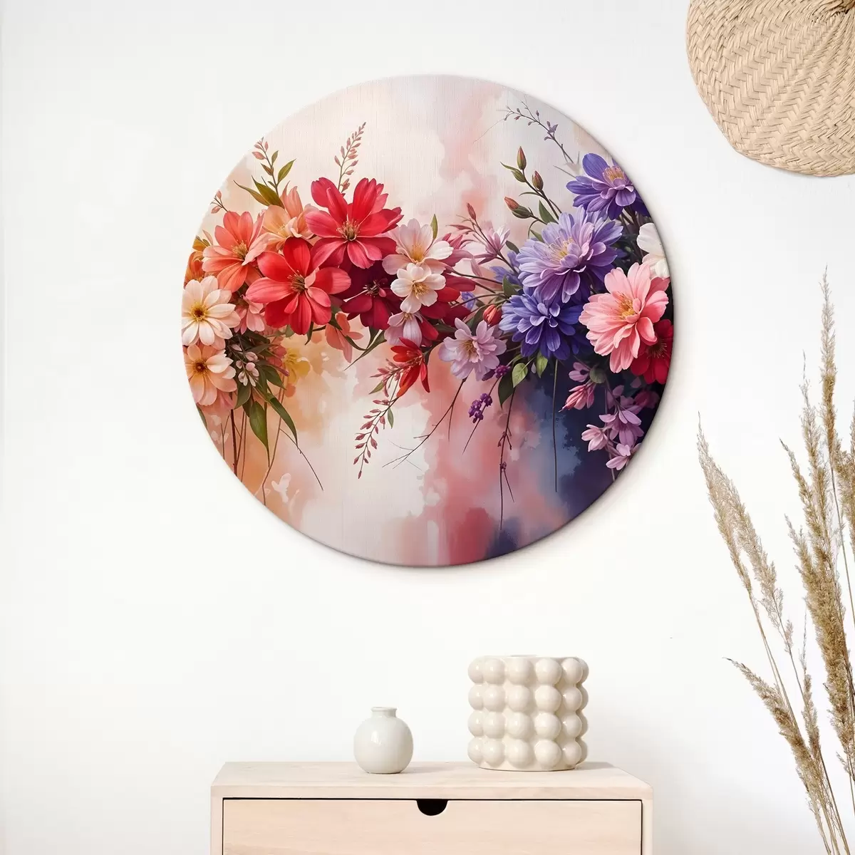 Quadri rotondi Fiori colorati, tra cui dalie rosse, rosa e viola, margherite e altre fioriture su uno sfondo morbido e sfocato r42234