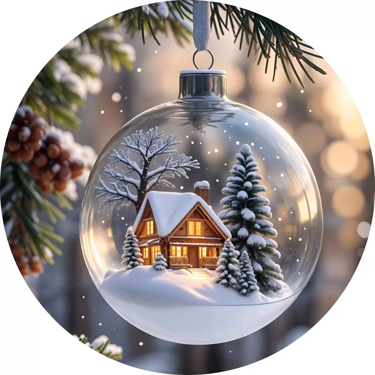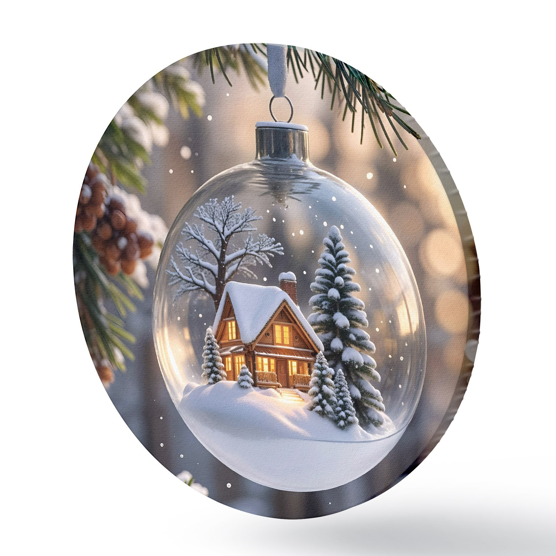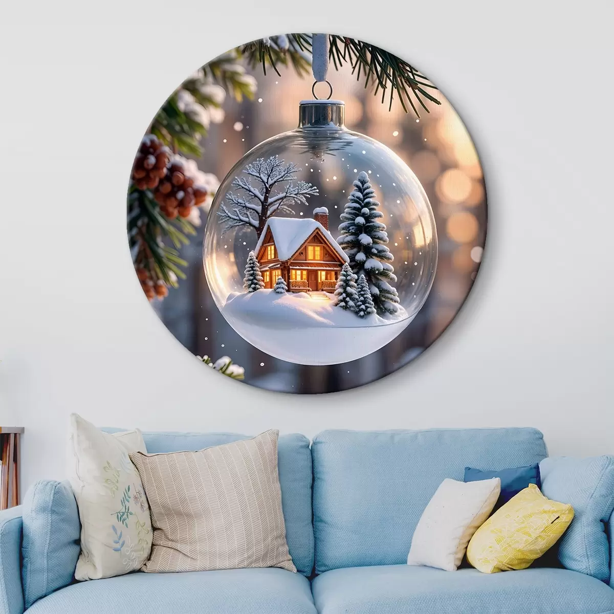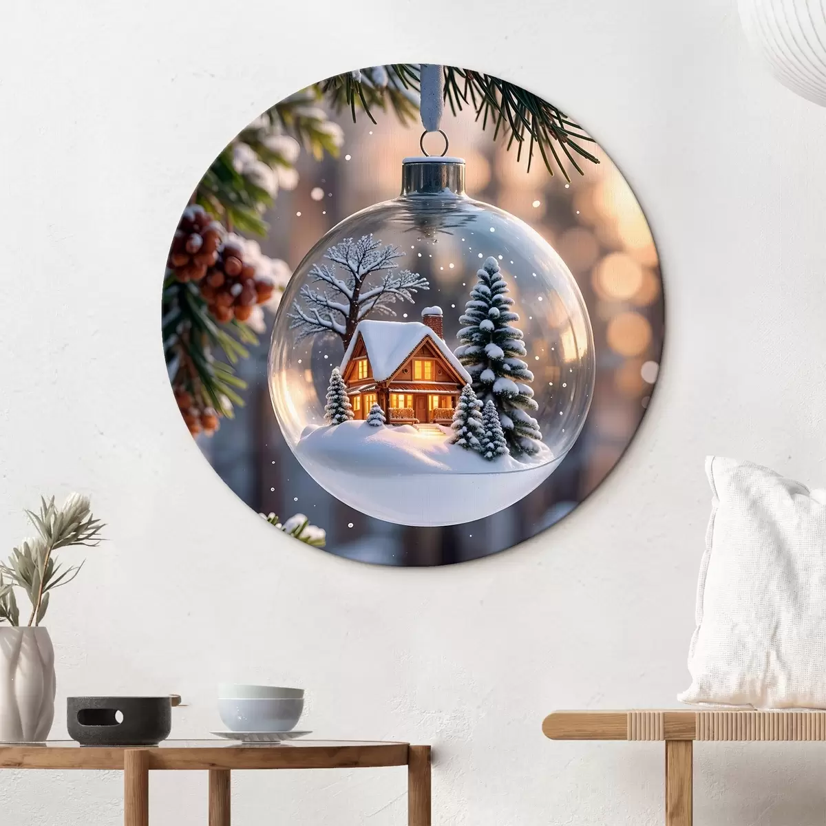 Quadri rotondi Mappamondo natalizio in vetro con all'interno un paesaggio invernale innevato, caratterizzato da un'accogliente baita nel bosco con alberi di pino r42236