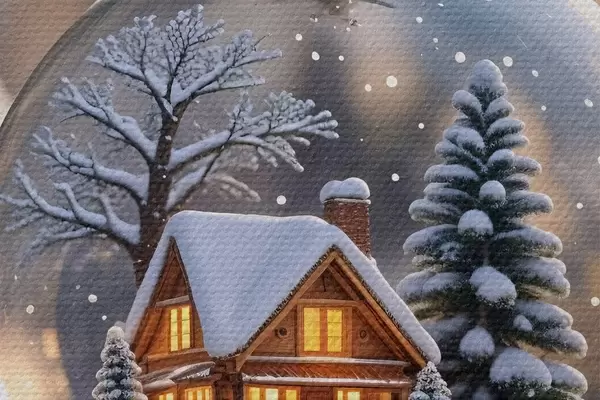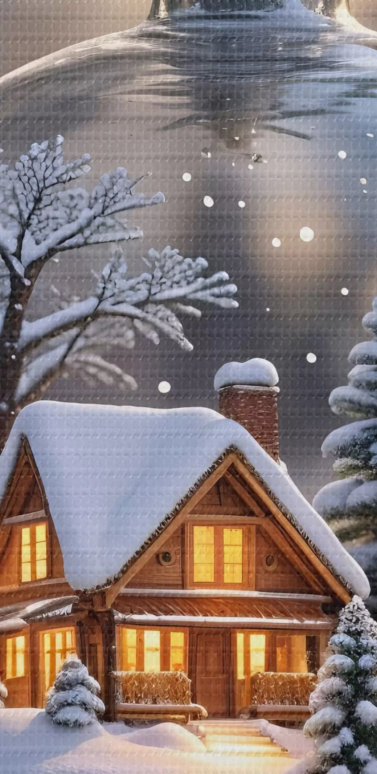 Immagine Mappamondo natalizio in vetro con all'interno un paesaggio invernale innevato, caratterizzato da un'accogliente baita nel bosco con alberi di pino Nr r42236